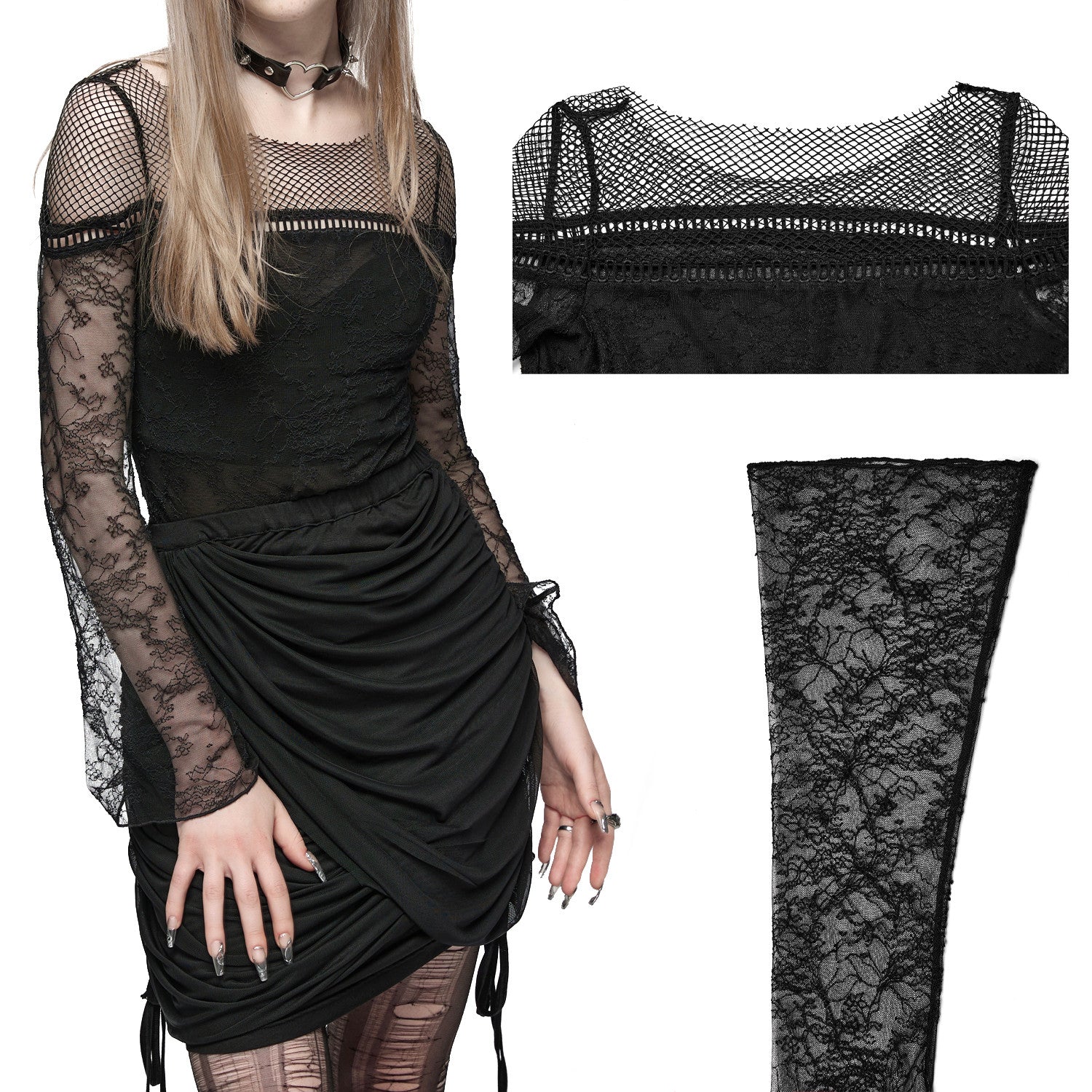 Destaca-te com a nossa sensual t-shirt transparente preta de renda, que apresenta mangas compridas e uma parte superior em rede que cobre os seios e os ombros. Esta peça combina elegância e provocação, perfeita para realçar o teu estilo gótico e alternativo.