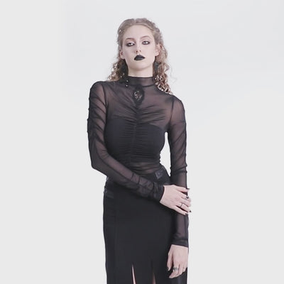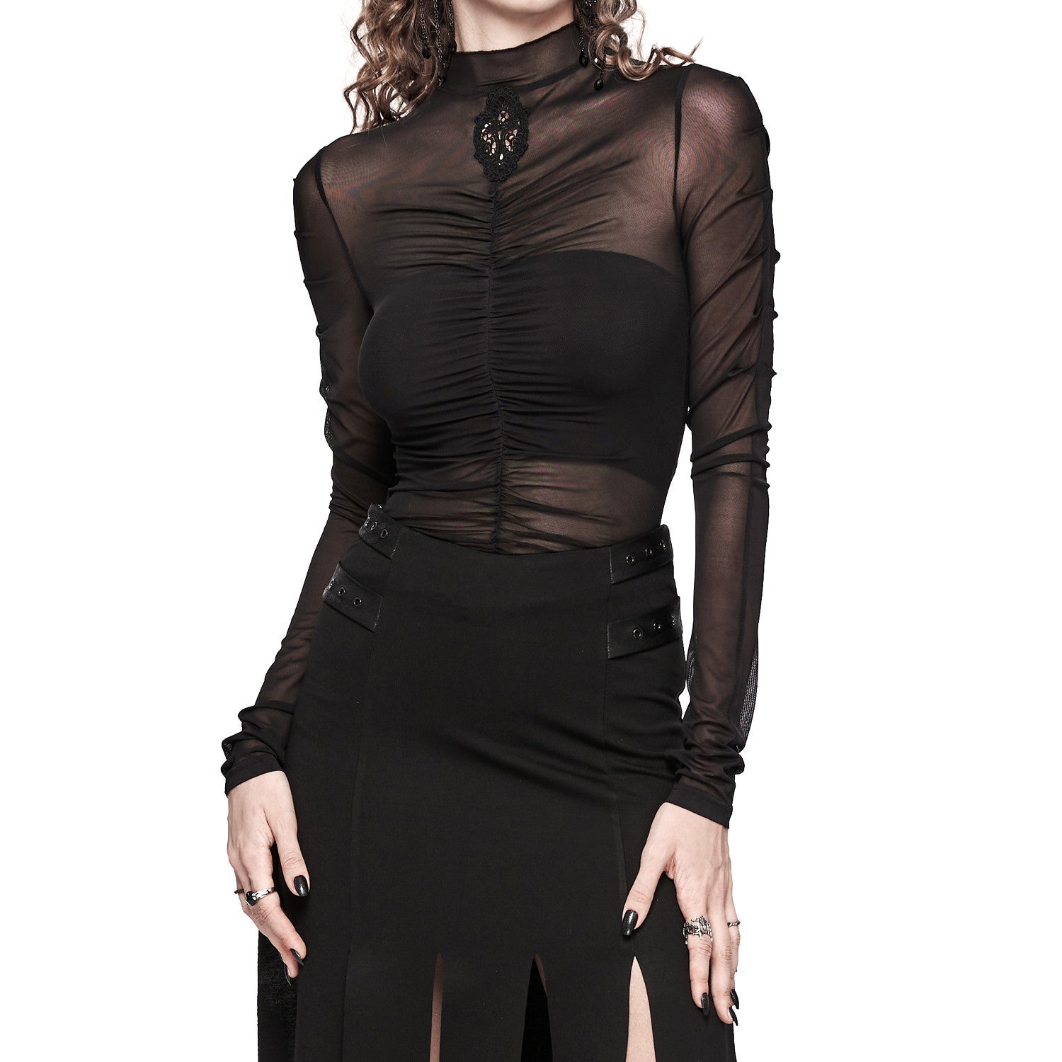 Explora a nossa t-shirt transparente preta de tule franzido, perfeita para um estilo gótico e alternativo. Com mangas compridas e um elegante detalhe de guipura no peito, esta peça é ideal para se destacar em qualquer ocasião. Composição desta t-shirt transparente: 97% poliamida, 3% elastano.