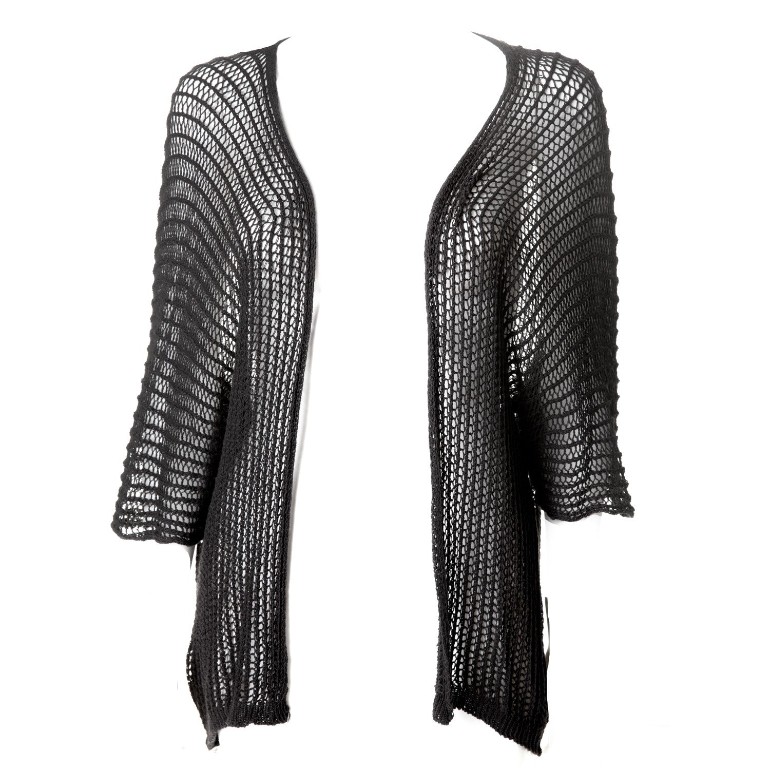 Cárdigan aberto e preto de rede, confeccionado com uma mistura de 50% acrílico e 50% algodão. Ideal para um look gótico e alternativo. Medidas do modelo: 86-72-100 cm. Altura: 170 cm.