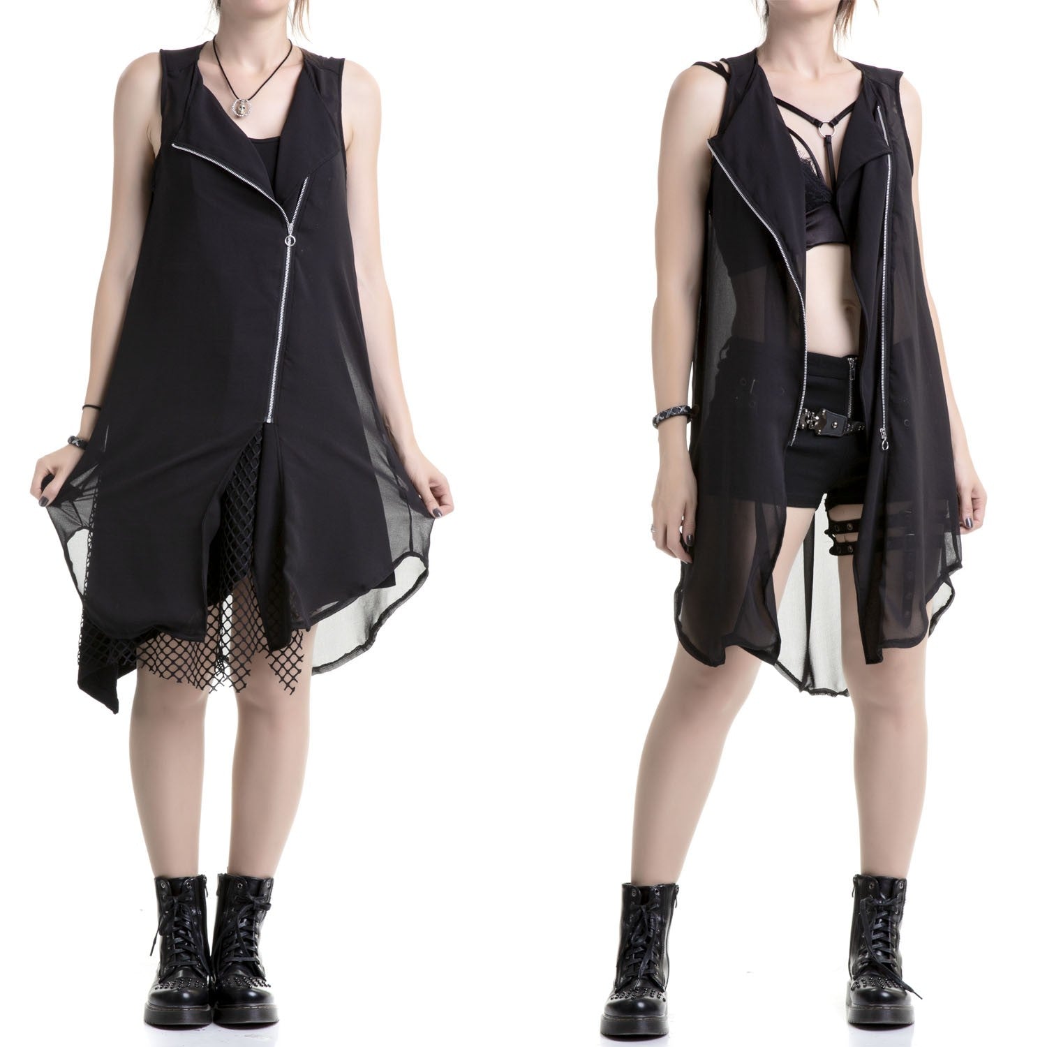 Colete preto, comprido e transparente de tule. Fecho de correr semi-lateral. Decote com lapelas.