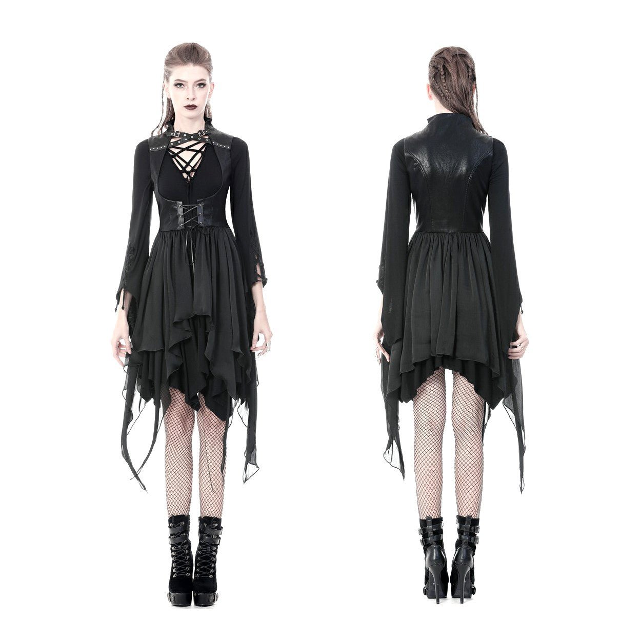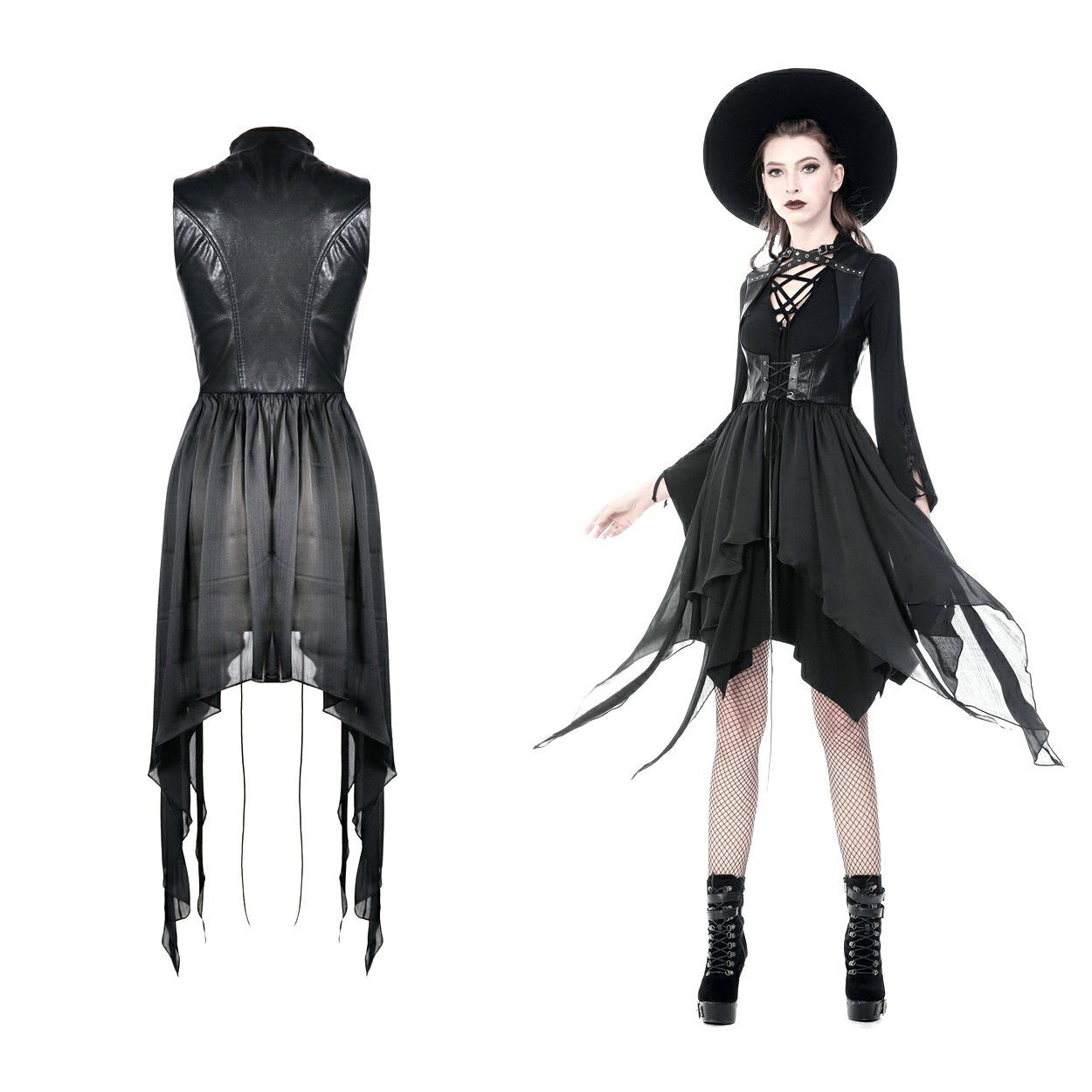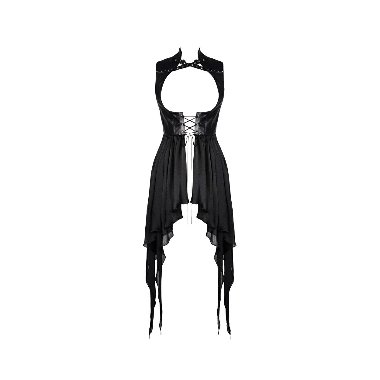 Colete tipo vestido preto com um cruzado à frente. Fivelas no pescoço.
