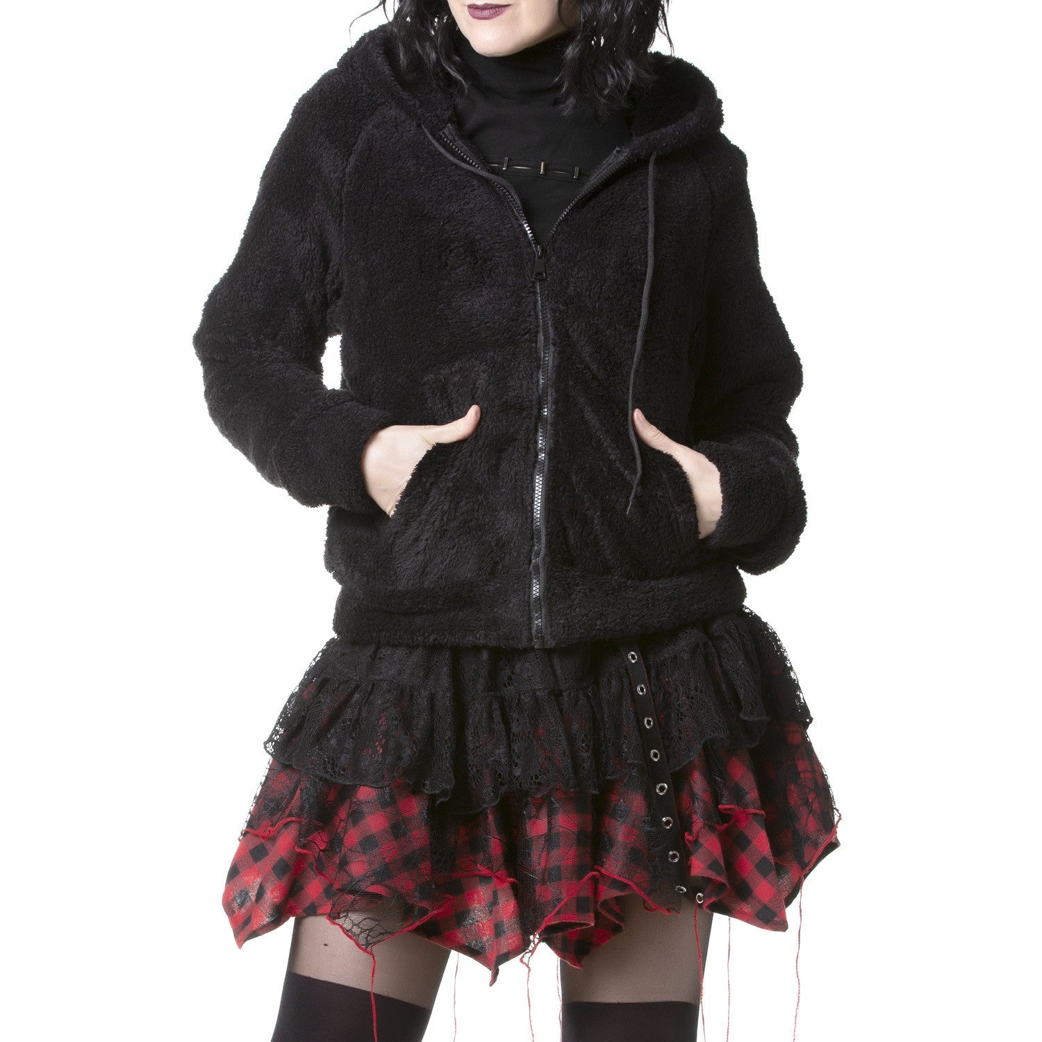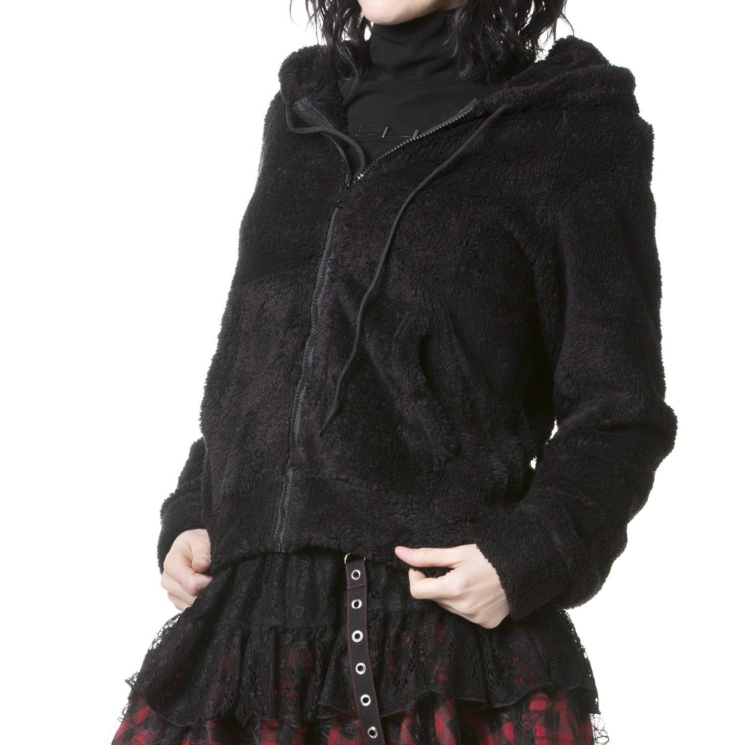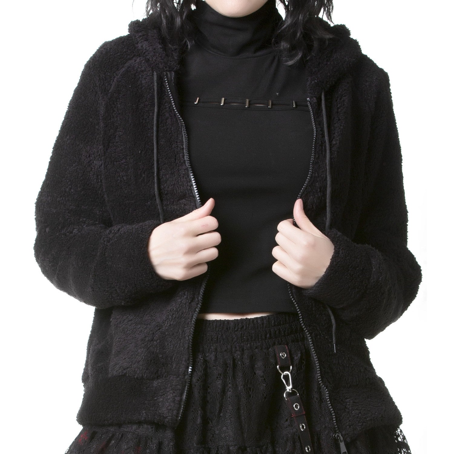 Casaco preto de textura suave e estilo alternativo, perfeito para se destacar na cena gótica. Com bolsos práticos e um capuz que adiciona um toque extra de mistério, este casaco preto é indispensável para o seu guarda-roupa. Fecha com um elegante fecho éclair na parte da frente, garantindo um ajuste confortável e moderno. Prepare-se para se destacar com esta peça única e versátil!