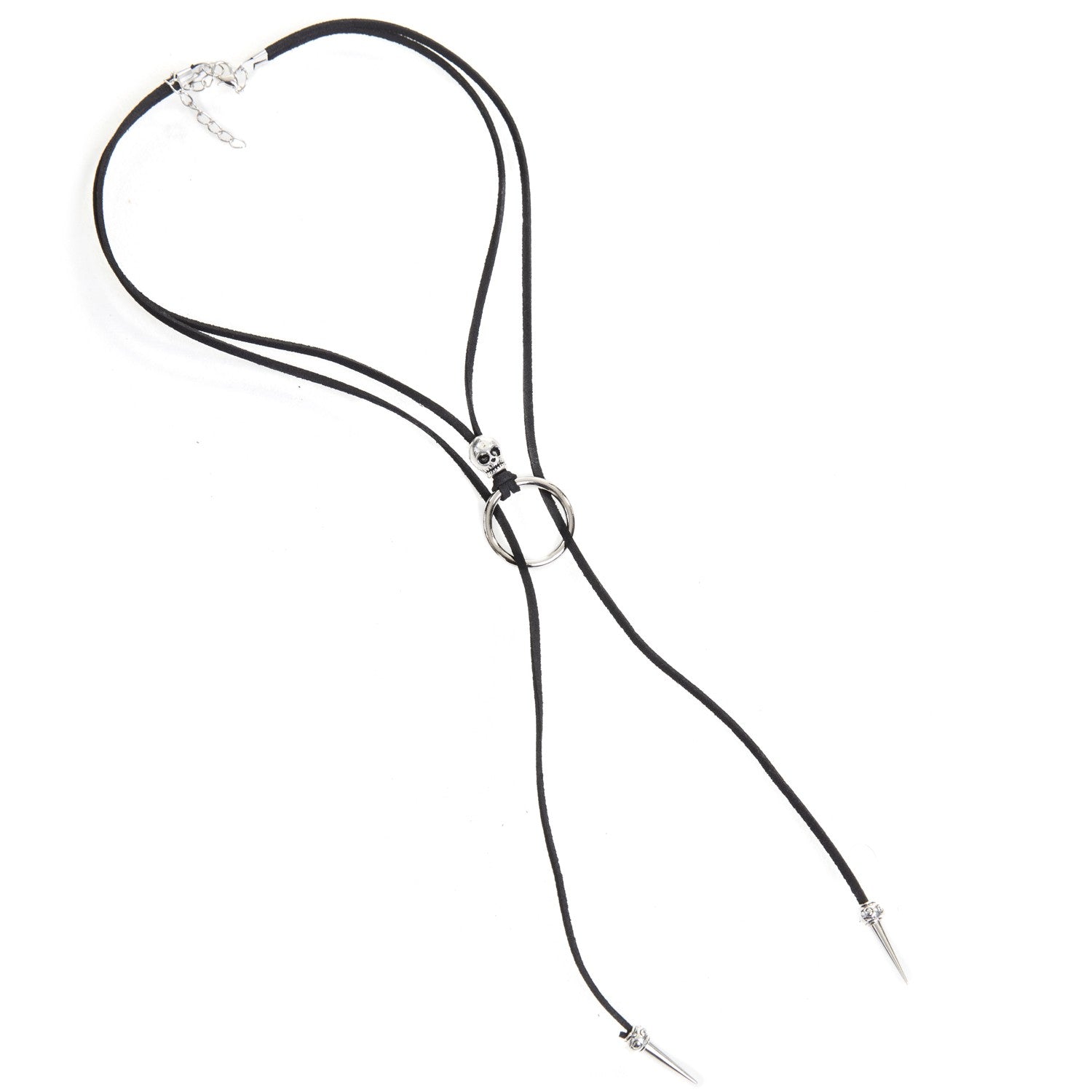Colar longo e preto com um anel, uma caveira e dois espigões prateados.