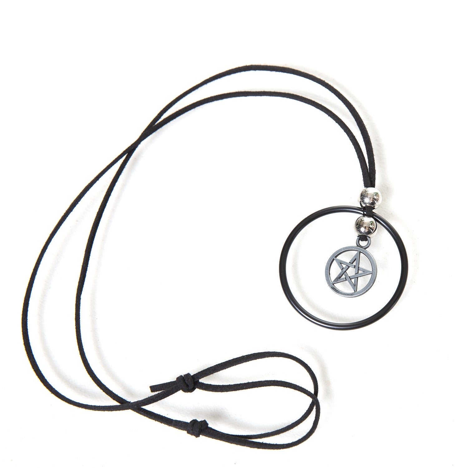 Descobre o encanto obscuro do nosso colar com pentagrama e aro negro! Este acessório destaca-se pelo seu design intrincado e misterioso. A corda é ajustável para oferecer um ajuste perfeito, permitindo-te personalizar o comprimento ao teu gosto. Ideal para quem procura adicionar um toque audaz e enigmático ao seu visual.
