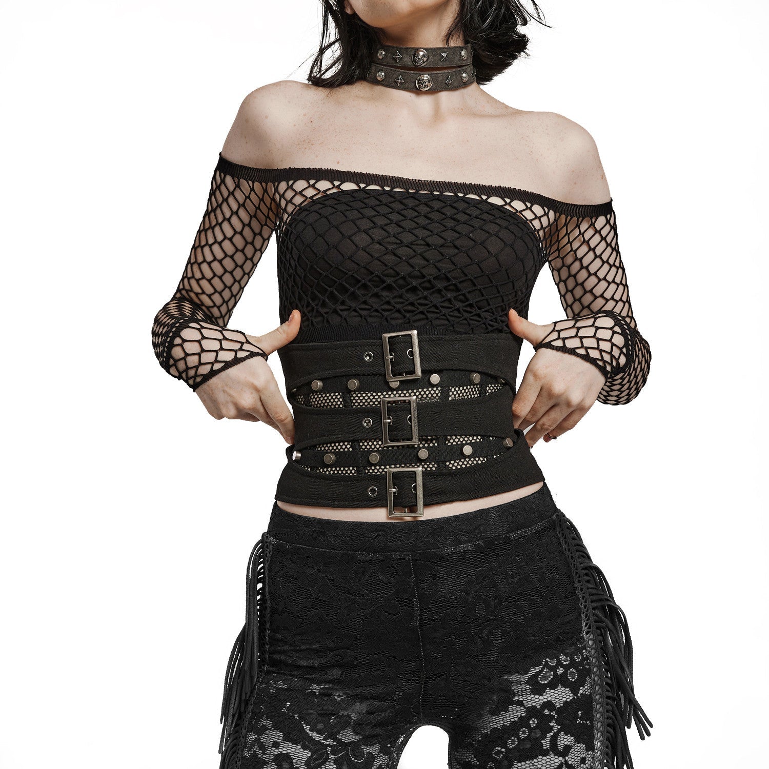 Realça o teu estilo alternativo com o nosso corpete abaixo do peito com rede e fivelas decorativas. Apresenta cordões cruzados e um fecho éclair nas costas para um ajuste perfeito e confortável. Fabricado com uma mistura de algodão, poliéster e elastano, este corpete abaixo do peito com rede e fivelas não só oferece um aspeto único, mas também conforto durante todo o dia.