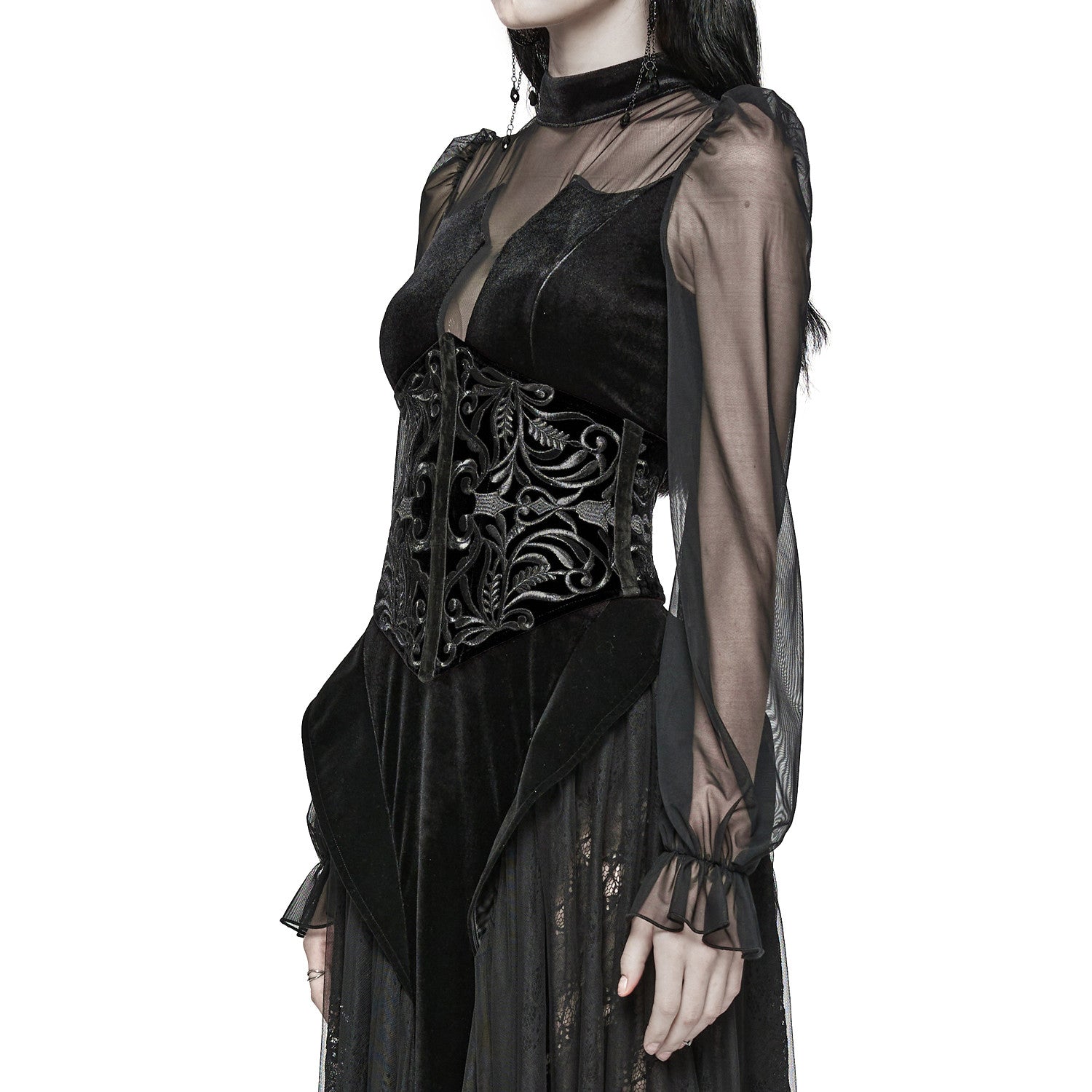 Realce o seu estilo alternativo com o nosso chamativo corpete preto abaixo do peito com filigranas. Apresenta detalhes intrincados de filigrana na parte da frente, juntamente com cordões cruzados e um fecho éclair na parte de trás para um ajuste perfeito. Fabricado em veludo, este corpete preto abaixo do peito com filigranas não só oferece um aspeto elegante, como também proporciona conforto graças à sua composição de algodão, poliéster e elastano.