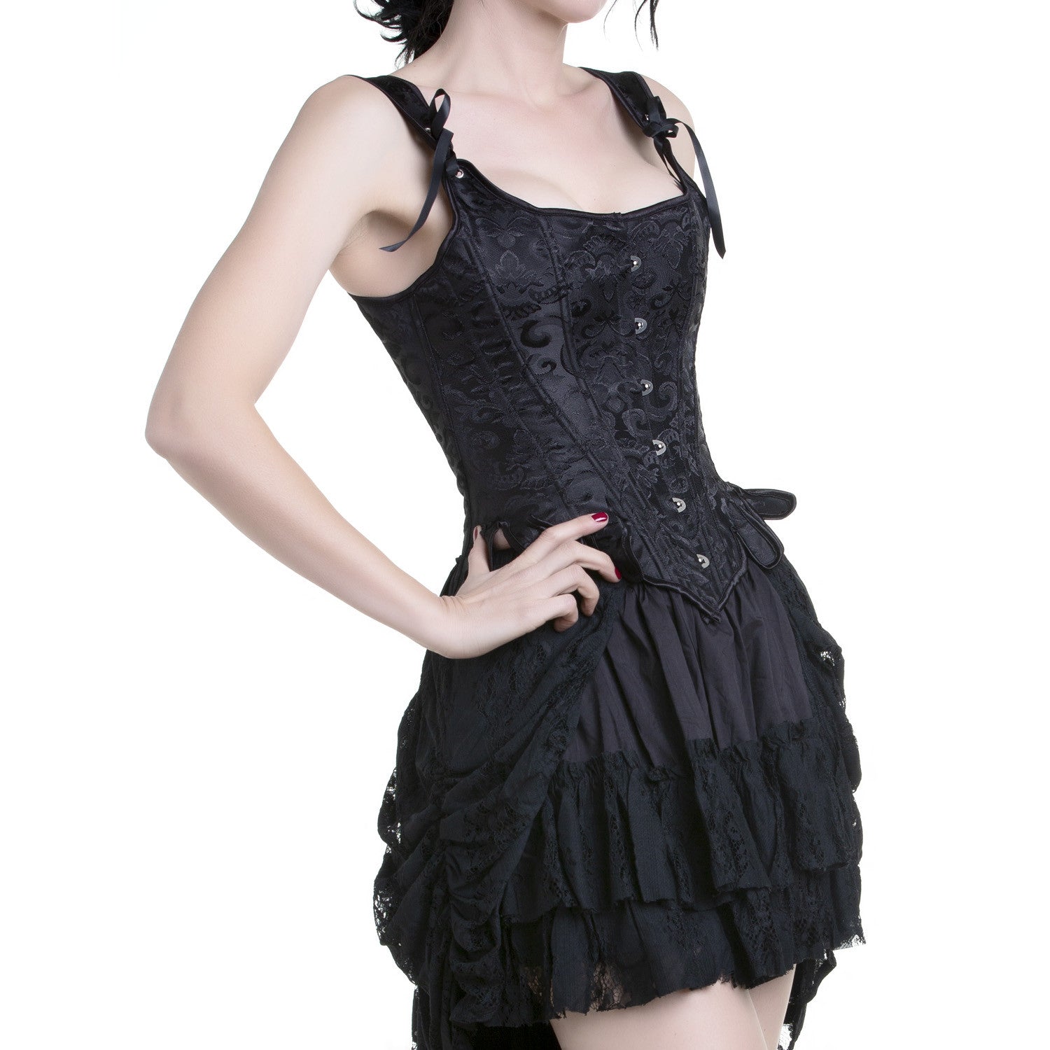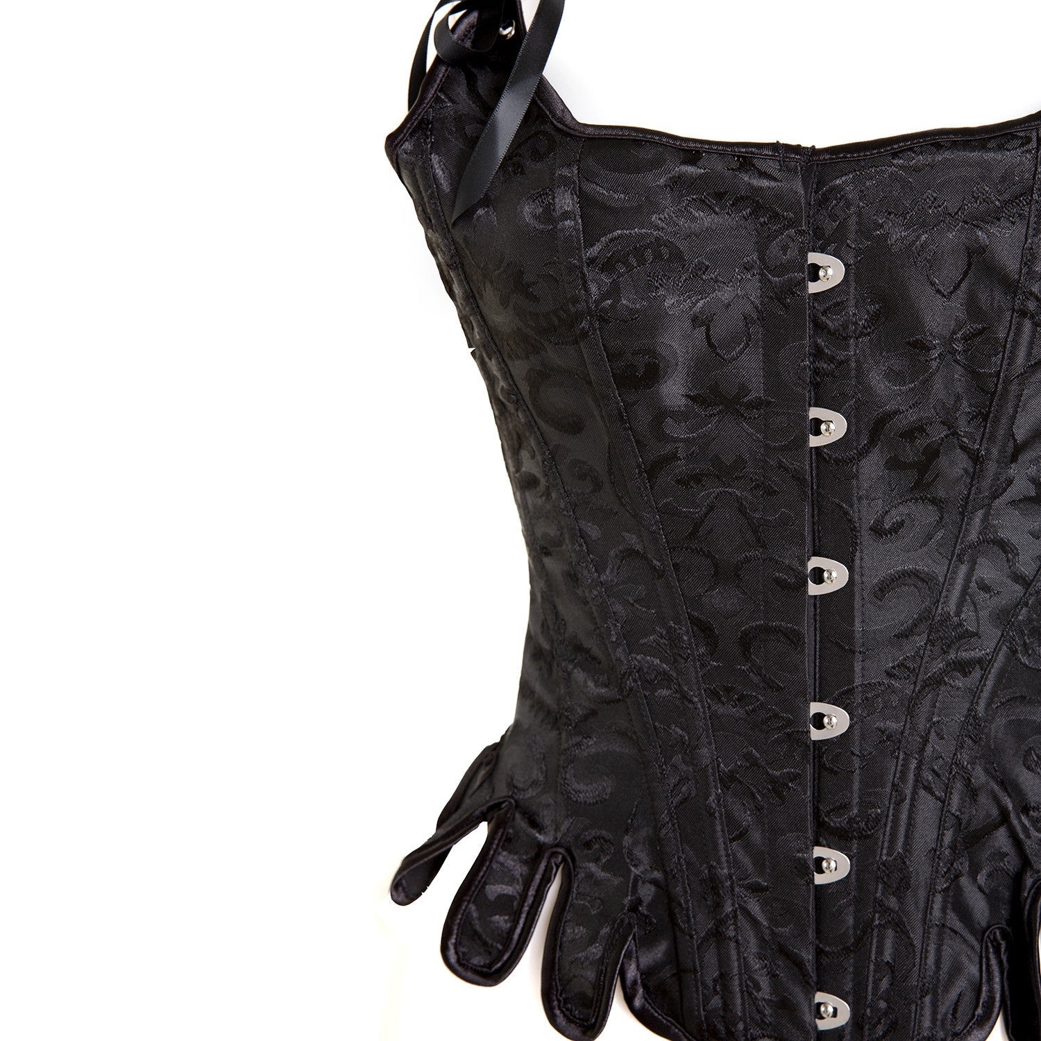 Descobre o nosso elegante corpete preto com alças, adornado com um intrincado desenho de filigranas. Com fechos de colchetes na parte da frente e cordões cruzados nas costas para um ajuste perfeito, este corpete apresenta uma pala traseira e 14 barbatanas de plástico que realçam a tua figura de forma impressionante. Confeccionado com uma composição de 90% poliéster, 5% algodão e 5% elastano, este corpete combina estilo e conforto na perfeição. As medidas da nossa modelo, com 88 cm de busto, 72 cm de cintura, 99 cm de anca e 170 cm de altura, destacam como este corpete se adapta graciosamente à figura feminina. Adiciona um toque de sofisticação e rebeldia ao teu estilo com este corpete único. Explora a nossa coleção online de roupa e acessórios góticos, alternativos e punk para descobrir mais peças exclusivas que realçarão a tua individualidade.