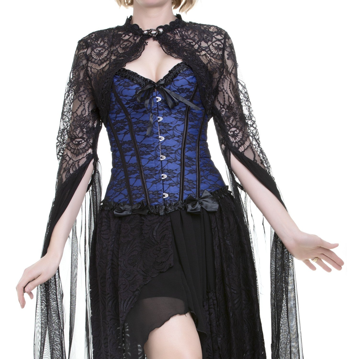 Corset azul e preto com renda, 12 barbatanas de plástico, pala traseira e fita de cetim para atar.