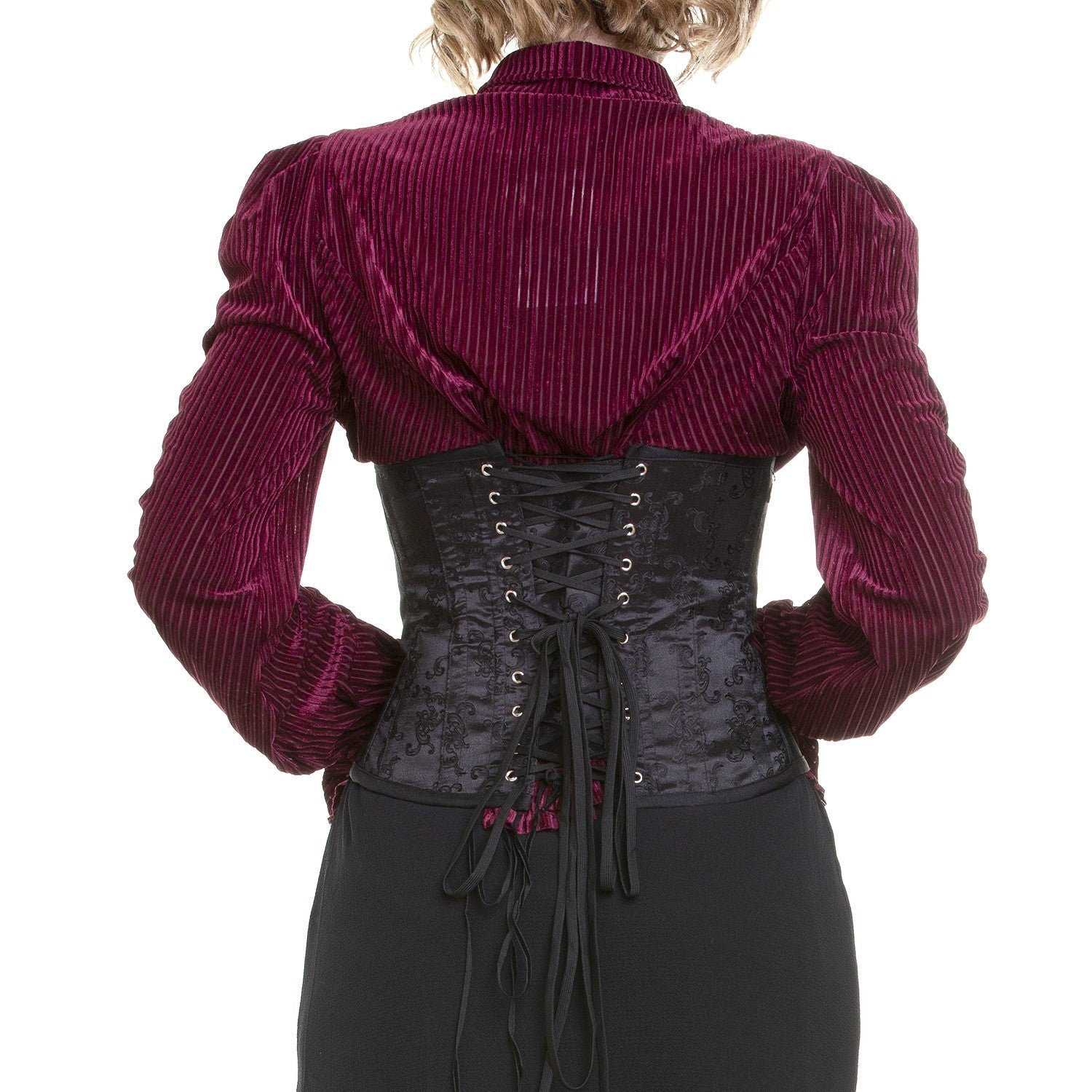 Corset abaixo do peito com aba traseira, 5 fechos metálicos à frente, 14 barbatanas de metal e cordões para ajustar nas costas.