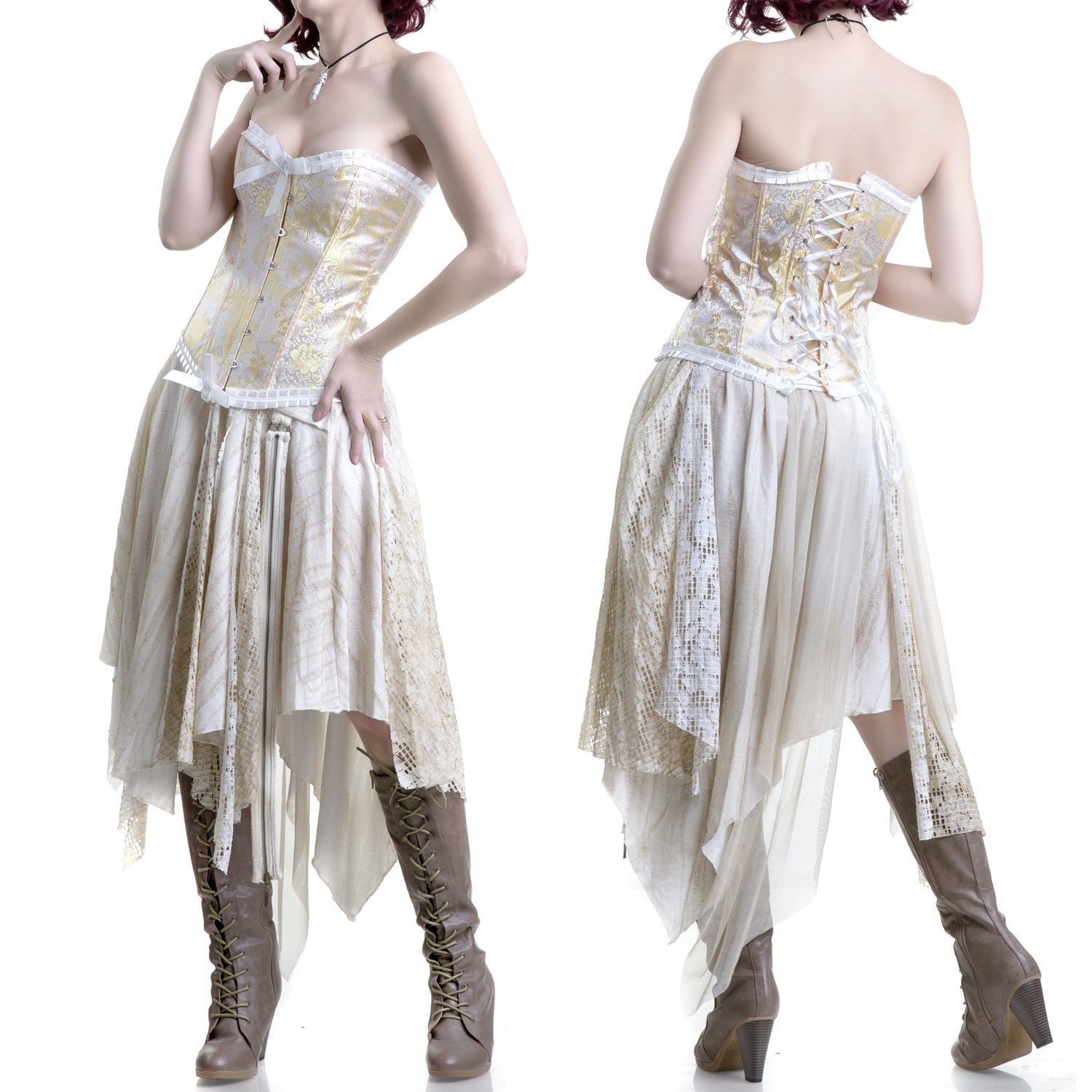 Corset branco com brocado dourado e laços. Fechos de mola à frente. Cruzado nas costas.
