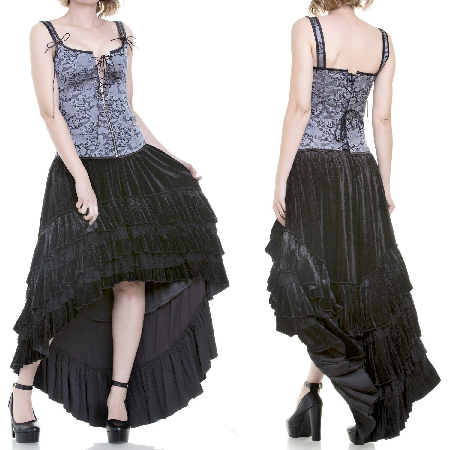 Corset cinzento com barbatanas de plástico, pala traseira, decote com cruzado ajustável e cordão de cetim para apertar as costas.