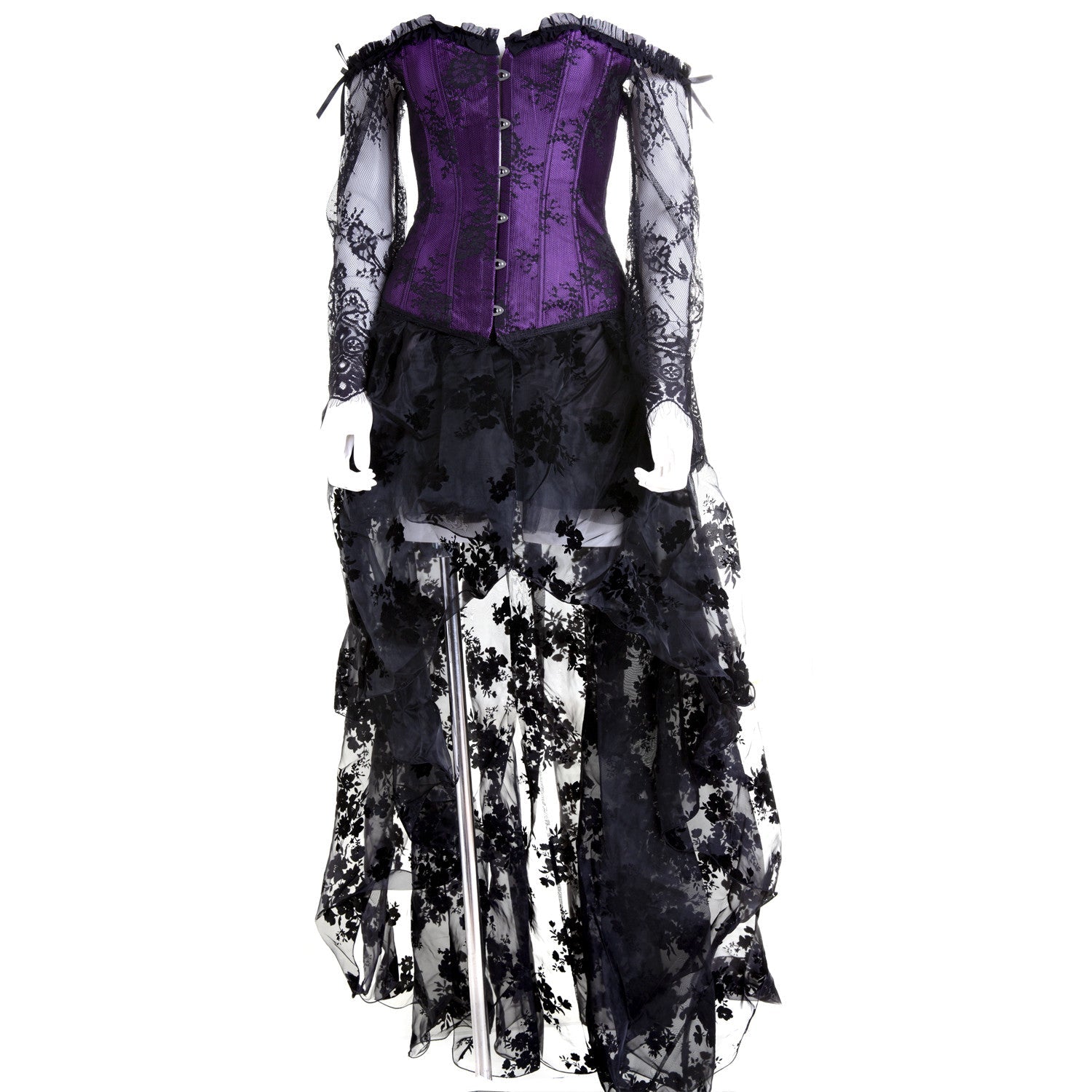 Experimenta a elegância alternativa com o nosso corpete lilás com saia! Este deslumbrante corpete apresenta mangas de renda e barbatanas de plástico que realçam a tua figura com um toque distintivo. A saia preta, elástica e adornada com renda, completa este conjunto arrojado e encantador.