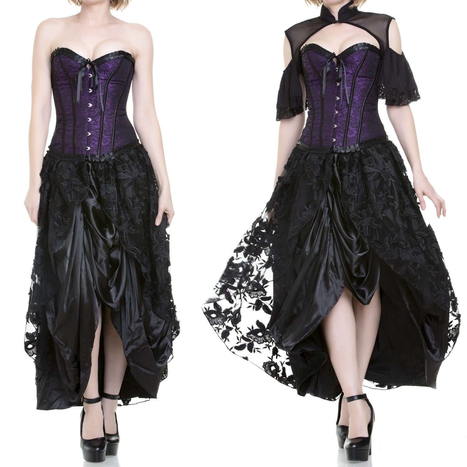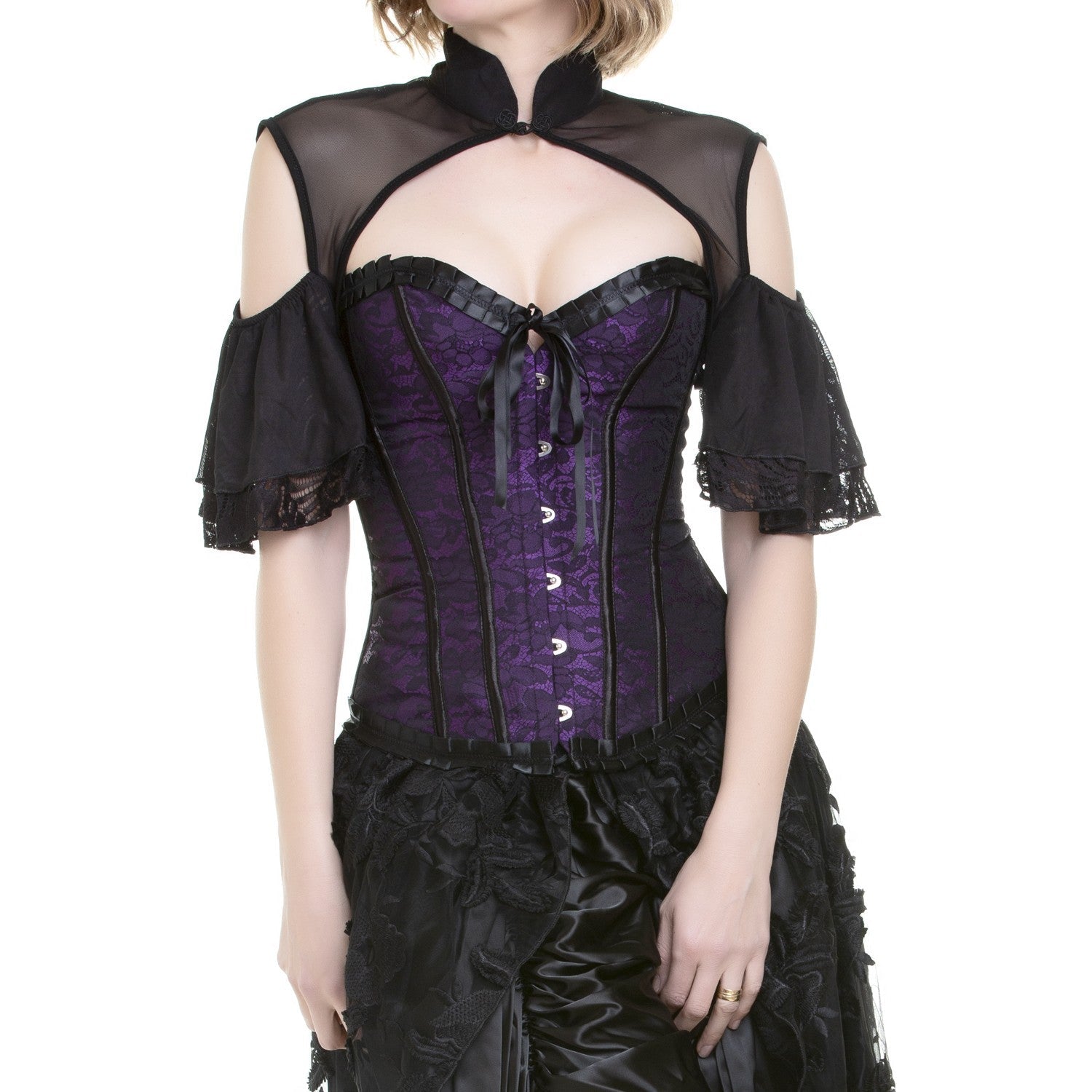 Corset lilás e preto com 10 barbatanas de plástico, pala traseira e fitas de cetim para ajustar nas costas.