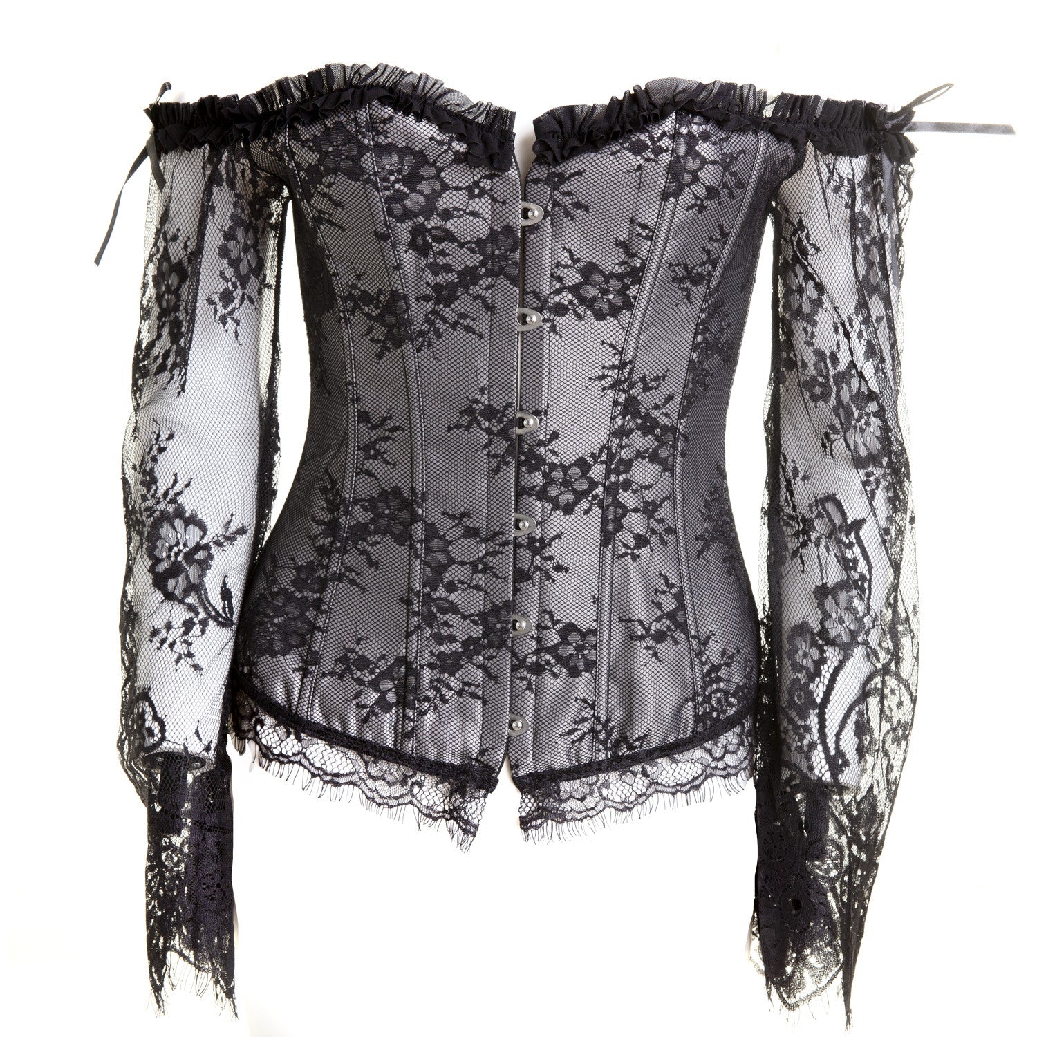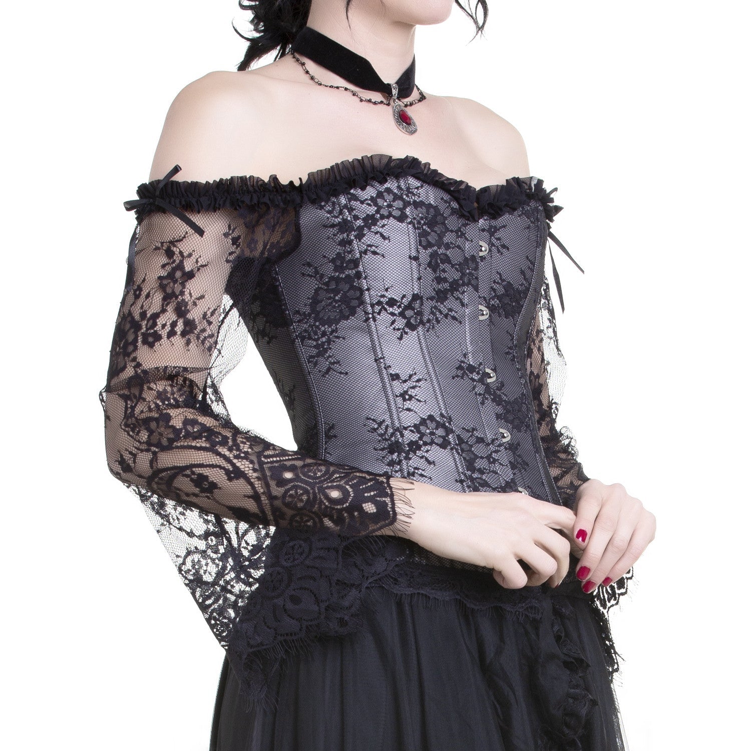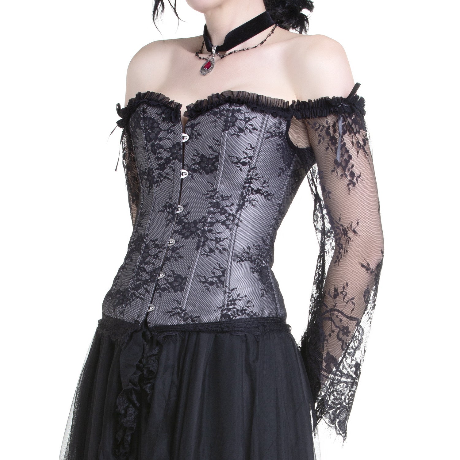 Experimente a elegância alternativa com o nosso corpete prateado! Este deslumbrante corpete apresenta mangas de renda e barbatanas de plástico que realçam a sua figura com um toque distinto. A modelo que o apresenta tem medidas de 88 cm de busto, 72 cm de cintura, 99 cm de anca e 170 cm de altura, demonstrando como este conjunto se adapta perfeitamente a diversas figuras.