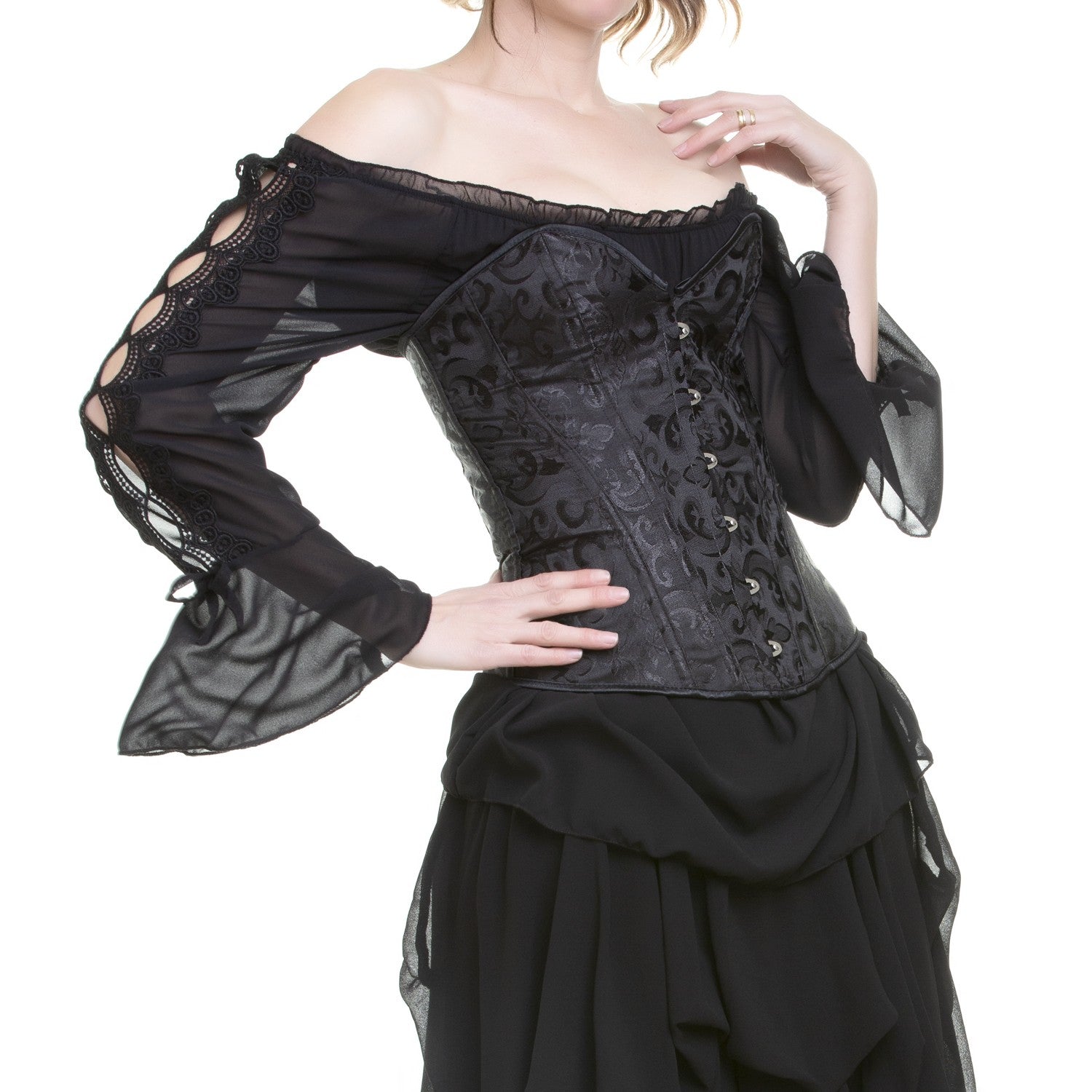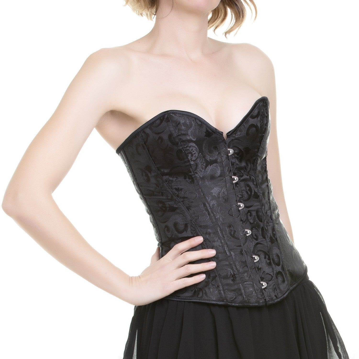 Corset negro com brocado, pala traseira, 12 barbatanas de metal e fita de cetim para ajustar nas costas.
