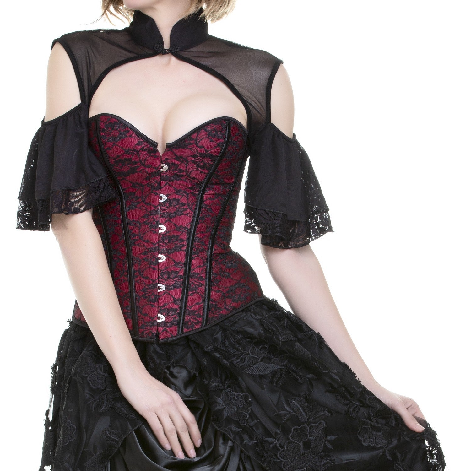 Corset vermelho e preto com renda, 12 barbatanas de plástico, pala traseira e fita de cetim para ajustar.