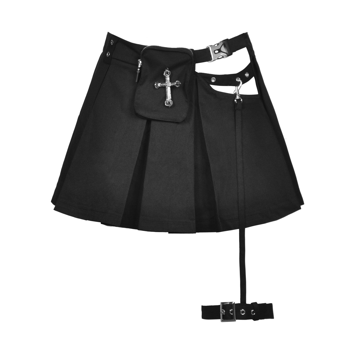 Saias curtas, pretas e assimétricas com uma liga e um bolso com uma cruz. Fecho éclair atrás.
