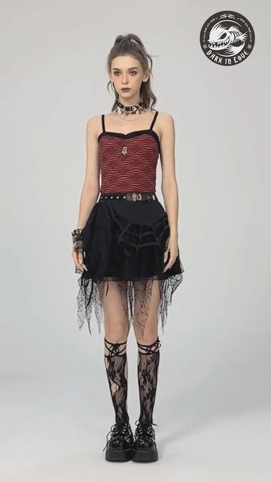 Saia curta e assimétrica de cor preta com um design de teias de aranha. Fabricada com 100% poliéster de alta qualidade. Perfeita para quem procura complementar o seu estilo gótico, alternativo e punk na sua roupa. Adicione um toque audaz e distintivo ao seu visual com esta saia única. Ideal para combinar com peças de roupa e acessórios de estética escura e rebelde. Faça uma declaração de moda com esta saia indispensável para os amantes da moda alternativa na nossa loja online de roupa e acessórios góticos, alternativos e punk!