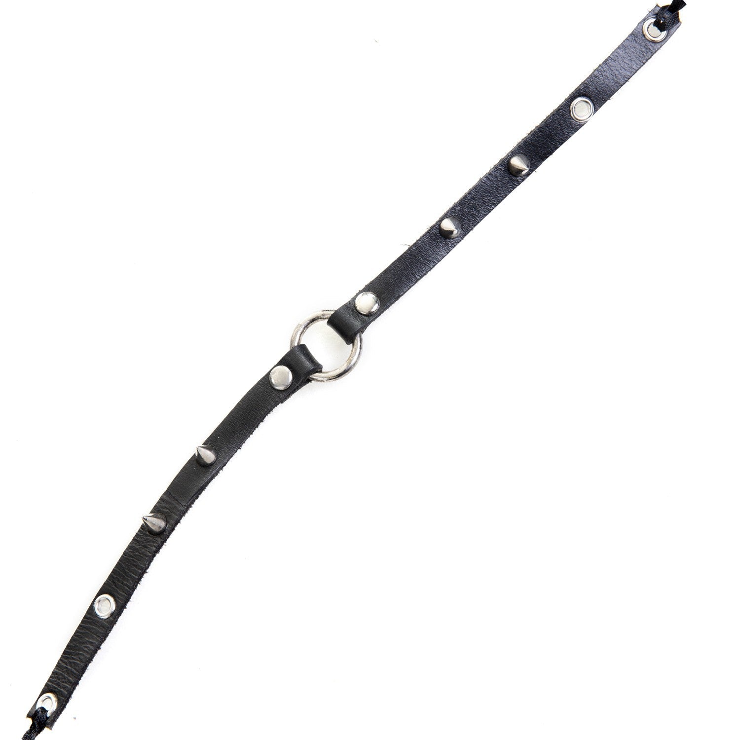 Gargantilha preta de couro bovino com um anel e espinhos.