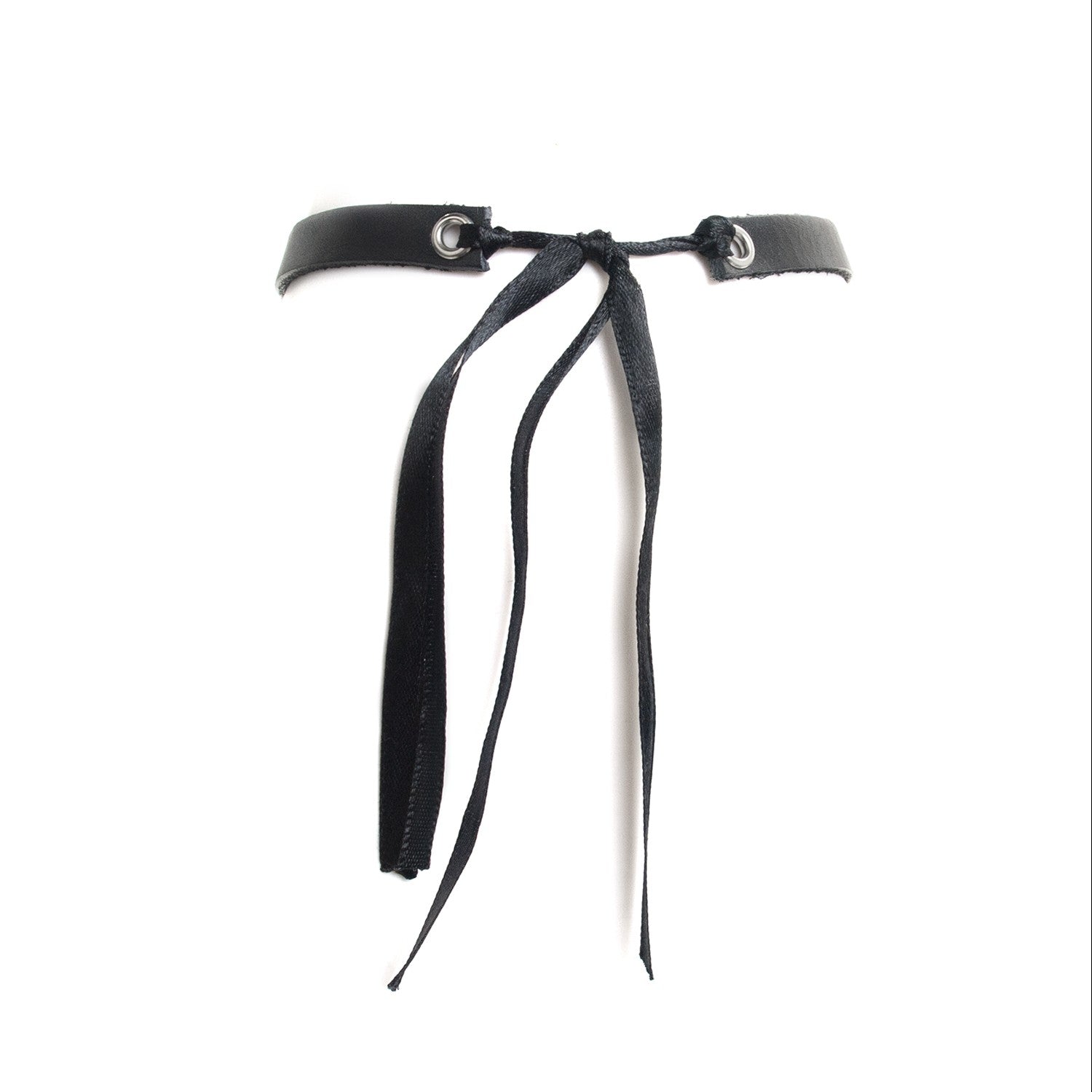 Gargantilha preta de couro com um aro e dois tachas à frente. Fecho por laço.
