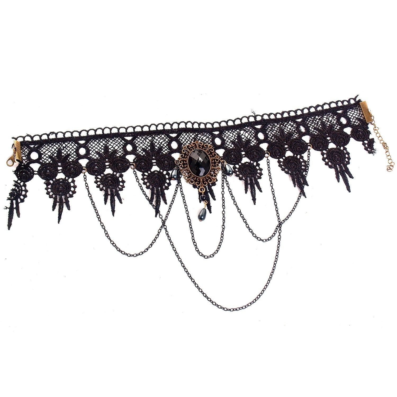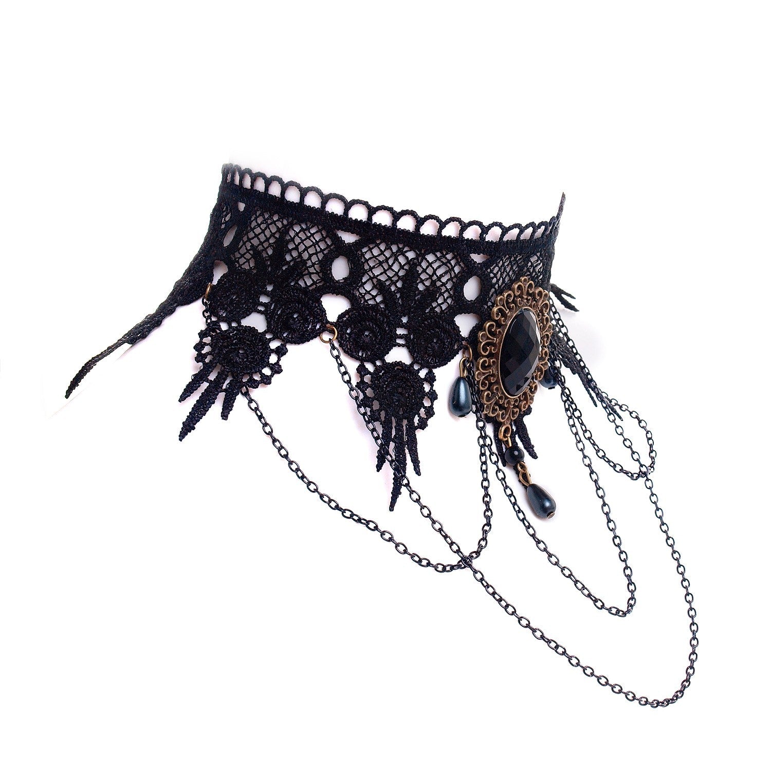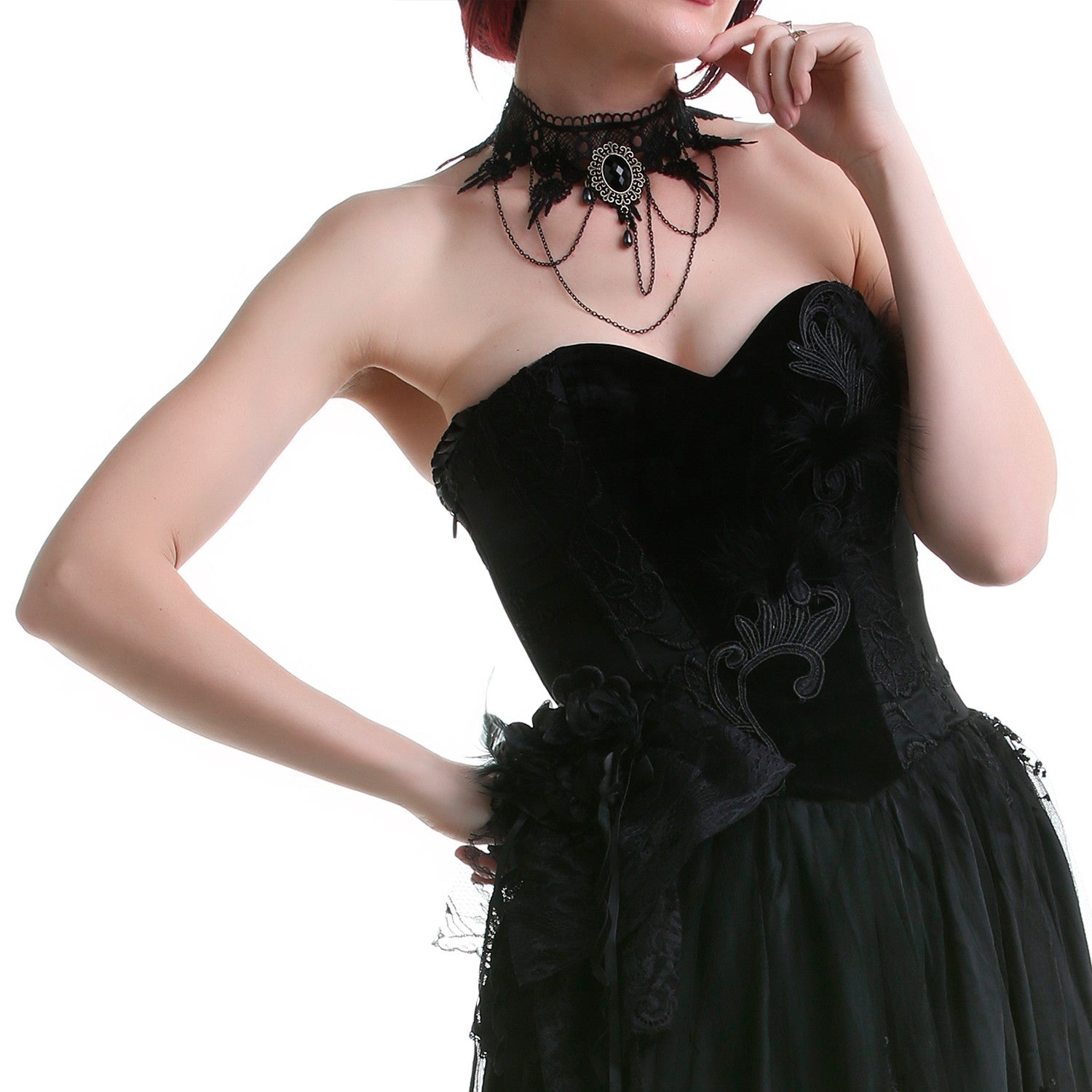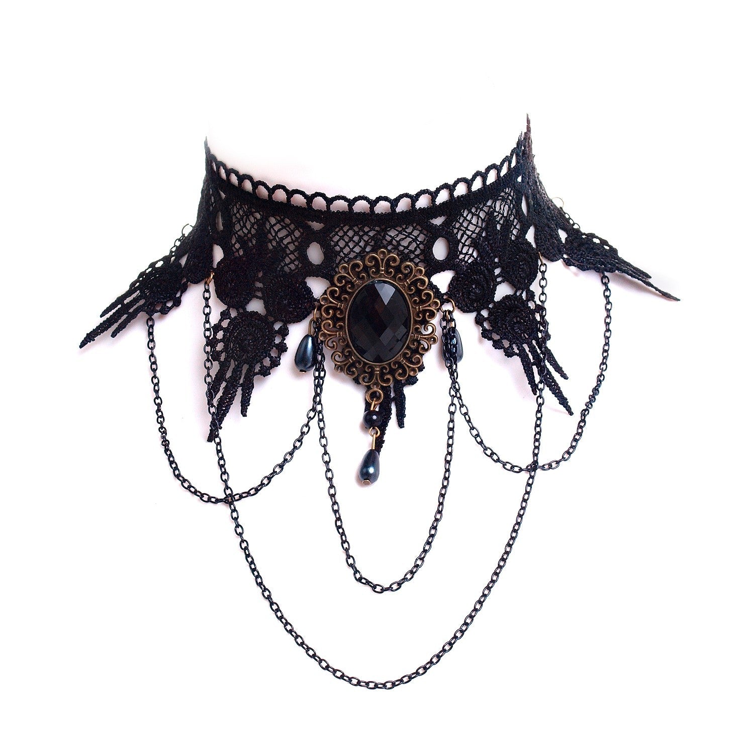 Gargantilha preta de guipura com elegantes correntes e um fecho de pedra preta, ideal para realçar o teu estilo alternativo. Feita para se destacar na cena gótica, esta peça combina a delicadeza da renda com um toque de rebeldia. Completa o teu visual com esta marcante gargantilha preta de guipura que acrescenta um toque de mistério e sofisticação.