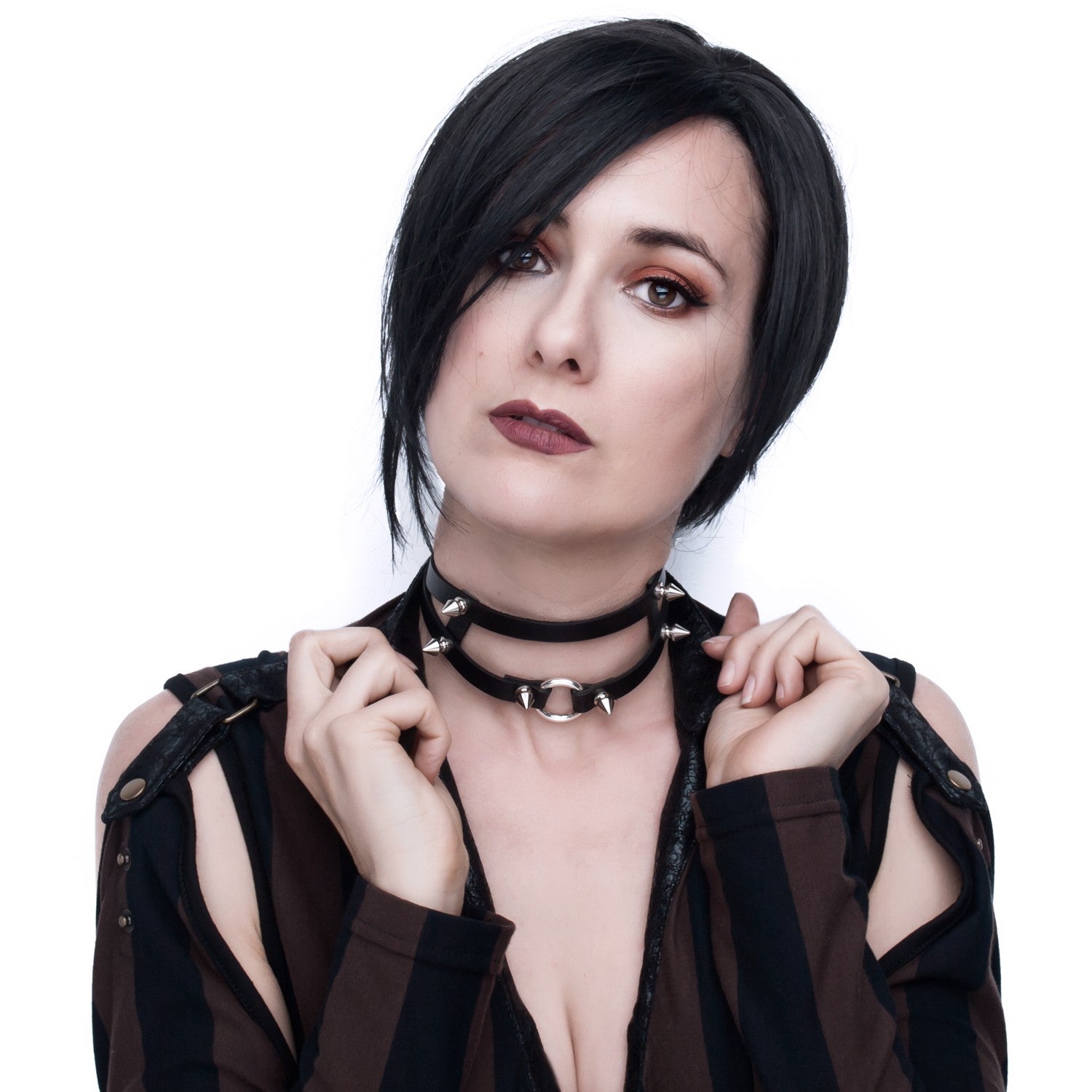 Gargantilha tipo arnês preta com um anel e detalhes de tachas, perfeita para destacar o teu estilo gótico e alternativo. Com o seu design único e marcante, esta gargantilha tipo arnês adiciona um toque distintivo a qualquer conjunto. Completa com um laço ajustável na parte de trás para um ajuste confortável e personalizado.