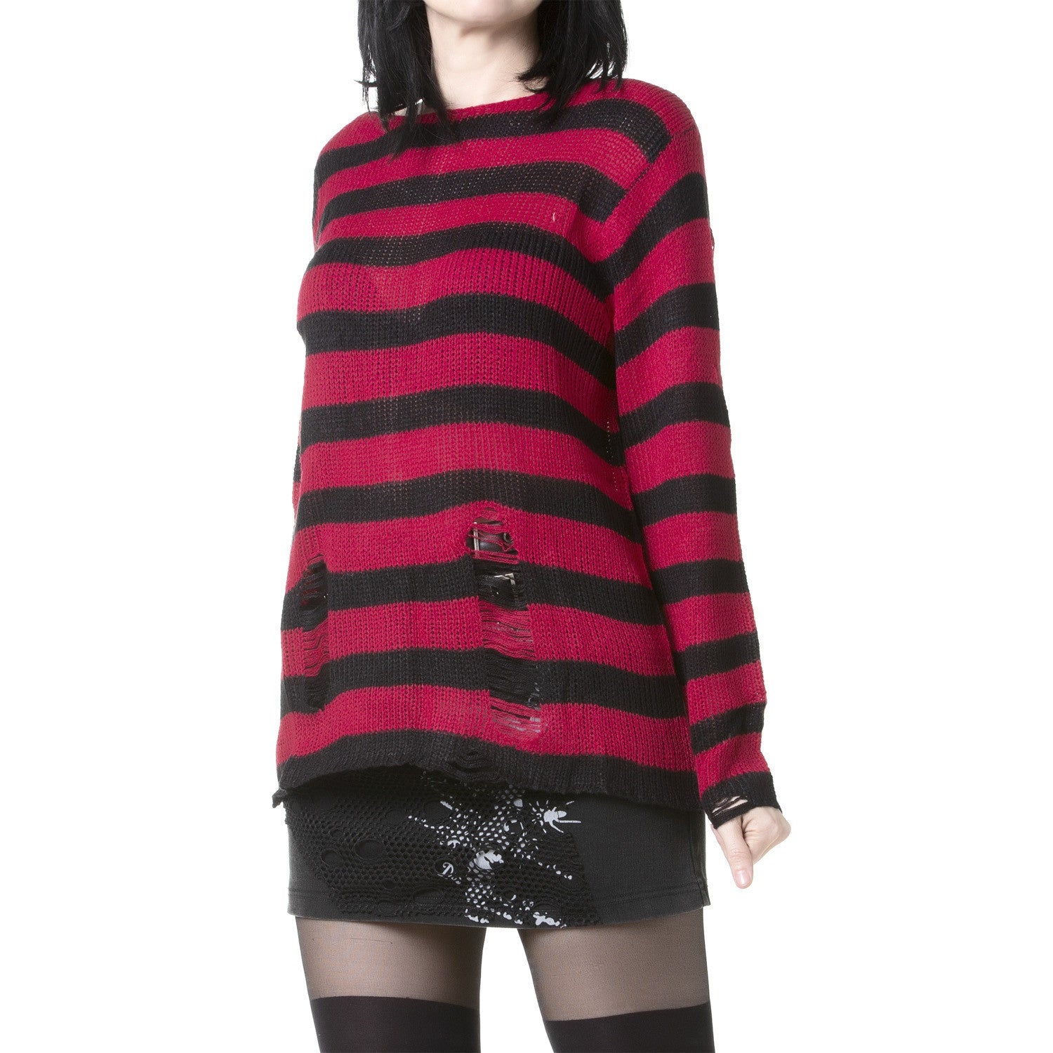 Explora a nossa camisola vermelho e preto de malha com um efeito rasgado marcante e riscas horizontais, uma escolha arrojada para o teu estilo gótico, alternativo ou punk. Confeccionada para se destacar, esta camisola combina o design moderno com um toque rebelde. Apresentada pela nossa modelo com medidas de 88 cm de peito, 72 cm de cintura, 99 cm de anca e 170 cm de altura, esta camisola adapta-se elegantemente à figura feminina. Adiciona um elemento distintivo ao teu guarda-roupa com esta camisola vermelho e preto único que funde estilo, conforto e atitude. Descobre mais peças únicas na nossa coleção online de roupa e acessórios góticos, alternativos e punk. Composição: 100% acrílico