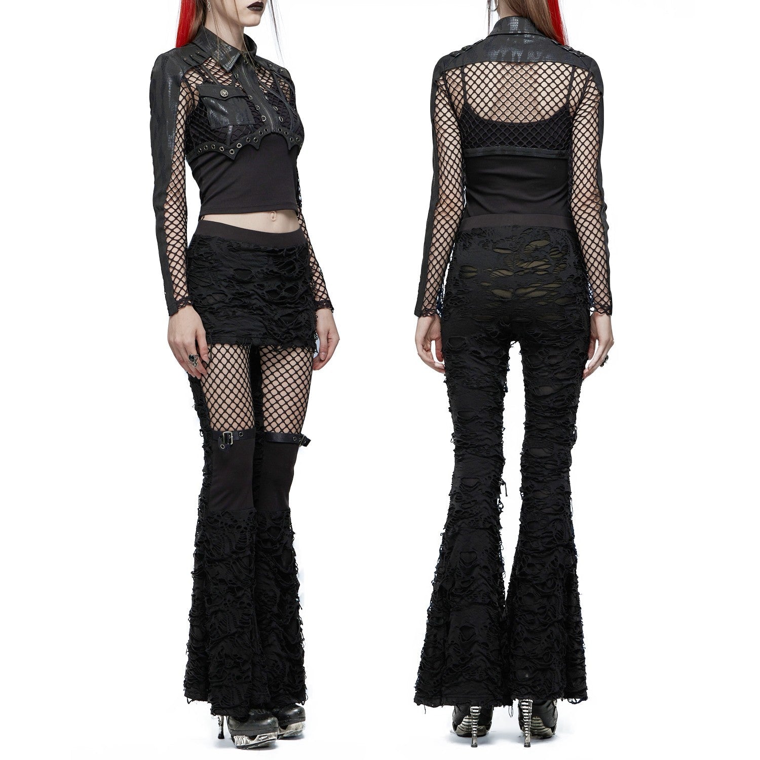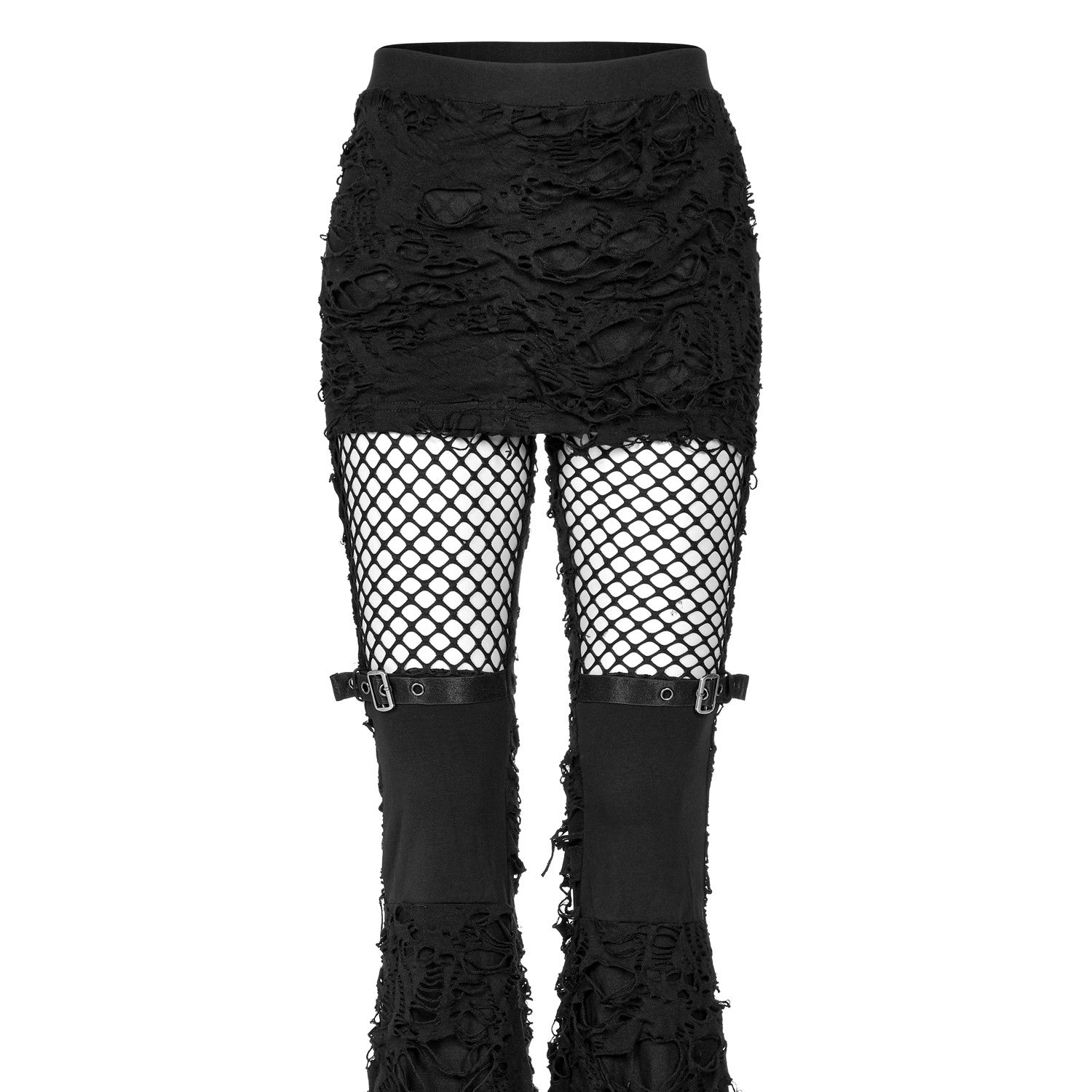 Legging preto e largo com design rasgado. Rede e fivela nas coxas.