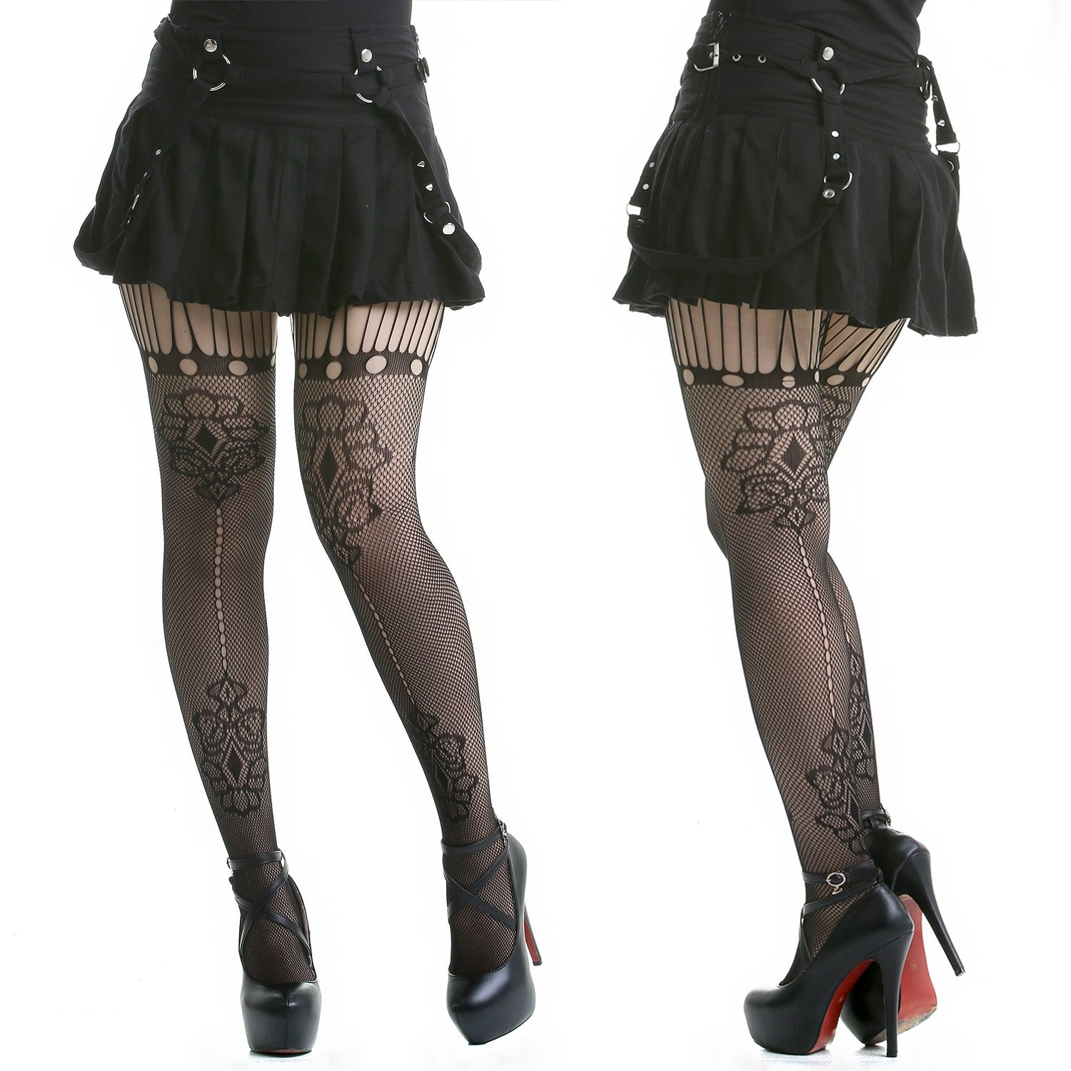 Meias pretas e elásticas de rede com tiras nas coxas.