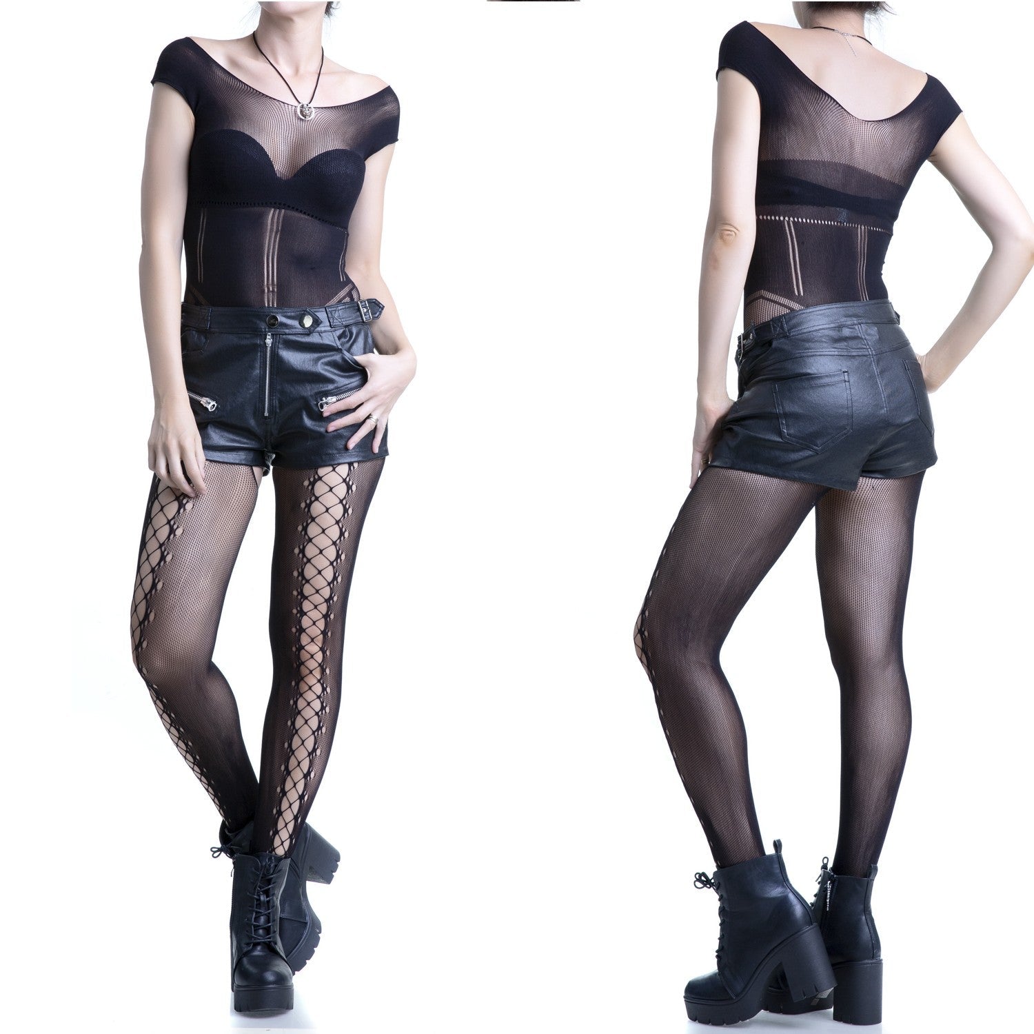 Collant preto e semitransparente com um design cruzado nas pernas. Tecido elástico.