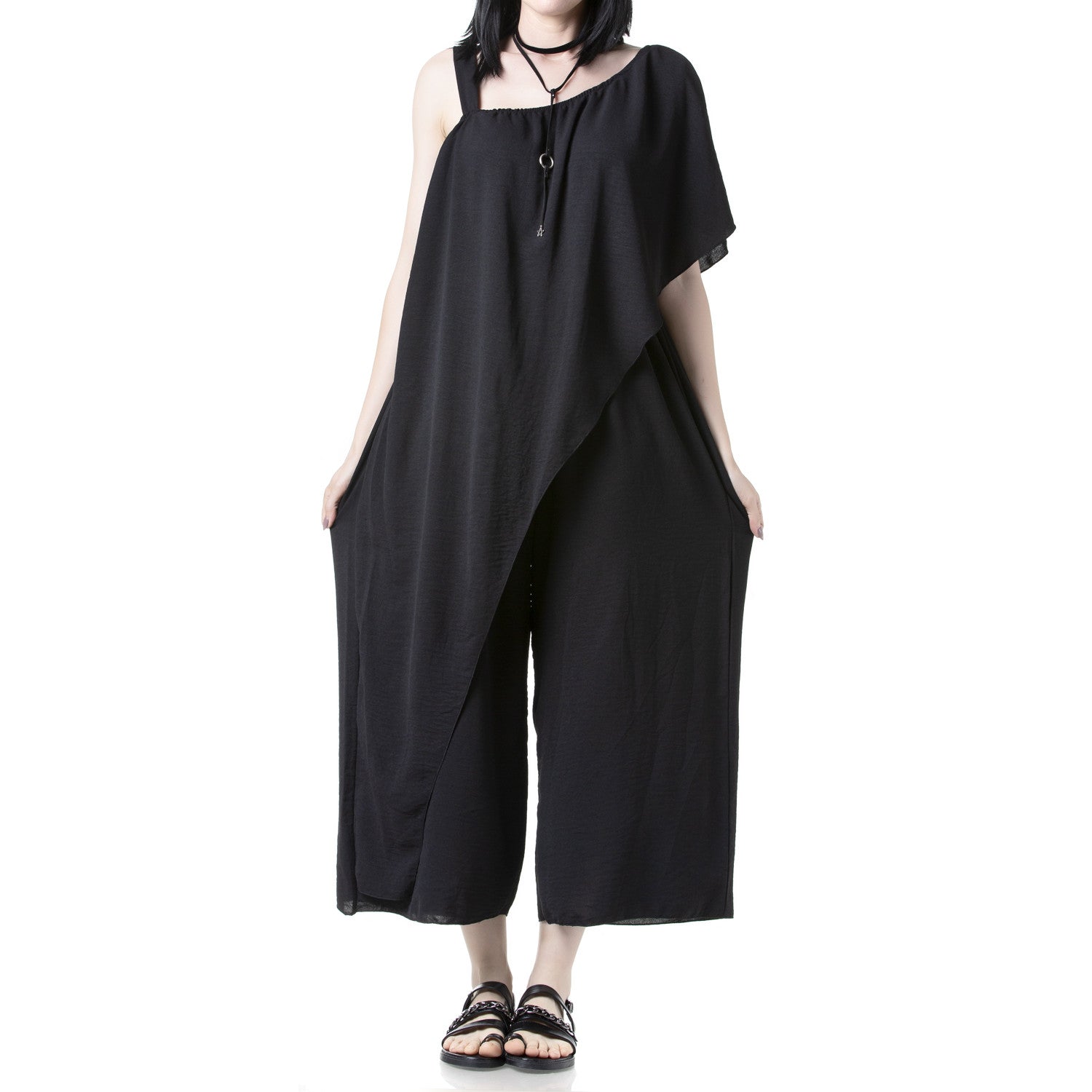 Para este verão não podes perder este incrível macacão preto com design largo e assimétrico. Feito de 95% poliéster e 5% elastano, garante um ajuste confortável e bonito. O nosso macacão preto é perfeito para destacar em qualquer ocasião!