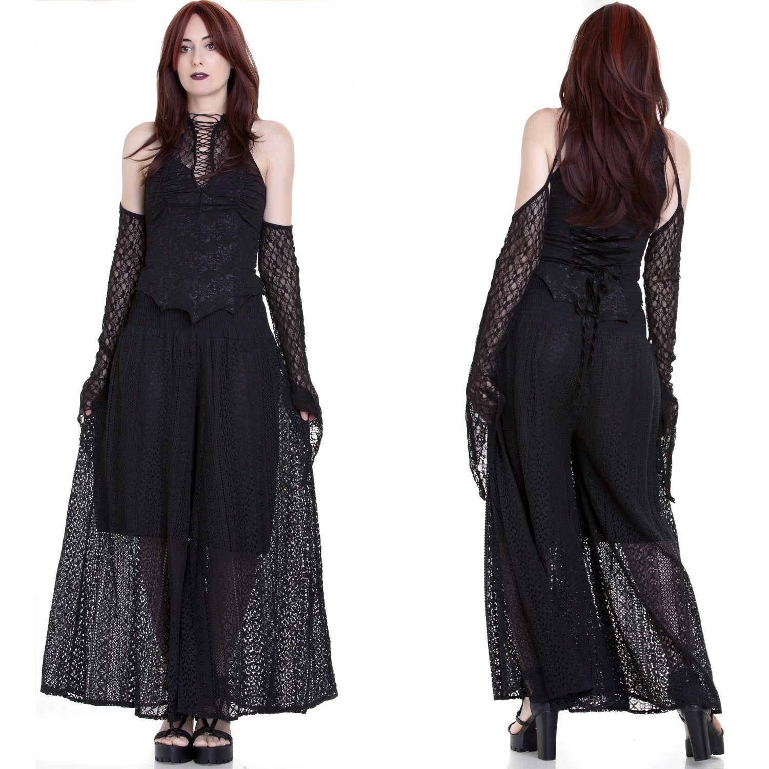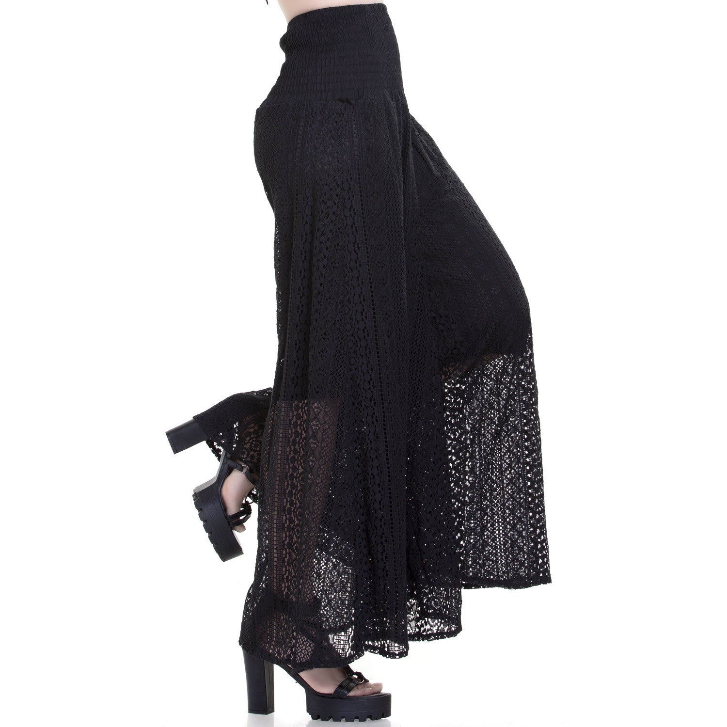 Não percas a oportunidade de adicionar esta peça excecional à tua coleção de moda. Acrescenta um toque distintivo e elegante ao teu visual com estas calças largas góticas de guipure semitransparente em preto.