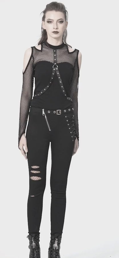 Calças pretas e assimétricas com uma fivela e um fecho éclair na cintura. Rasgões numa perna e um cruzado na outra perna.