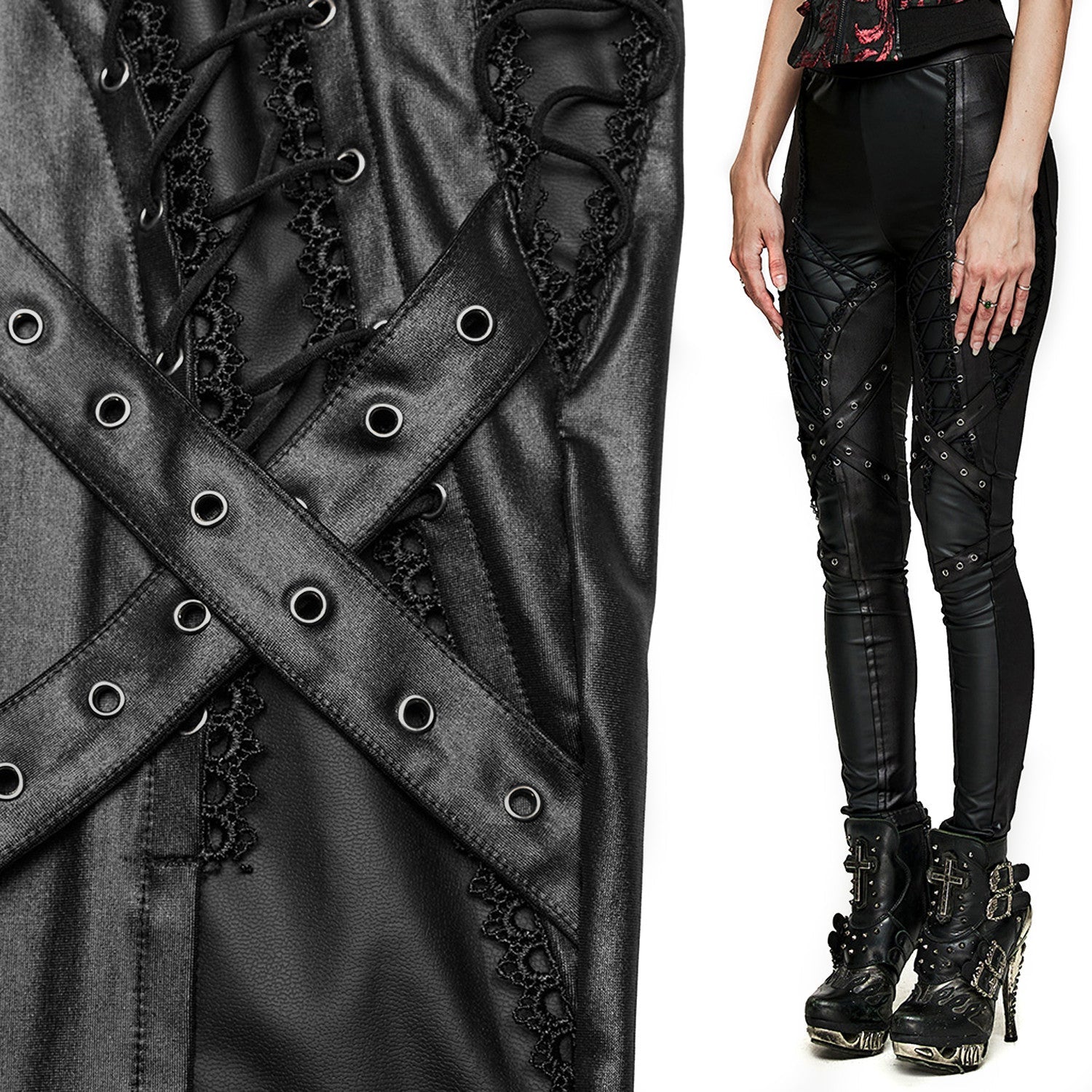 Descobre as nossas calças exclusivas com cruzados pretos, um essencial na moda gótica e alternativa. Estas calças elásticas e justas apresentam detalhes únicos com cordões cruzados decorativos nas coxas que adicionam um toque de rebeldia ao teu estilo. São feitas de poliéster e elastano para um ajuste confortável e duradouro. A modelo das fotos usa o tamanho XS e tem as seguintes medidas: 80cm de peito, 57cm de cintura, 72cm de anca e 173cm de altura. Estas calças com cruzados são a escolha perfeita para destacar a tua individualidade e expressar a tua paixão pela moda punk, gótica e alternativa. Adiciona-as ao teu guarda-roupa e cria looks únicos que refletem o teu estilo único.