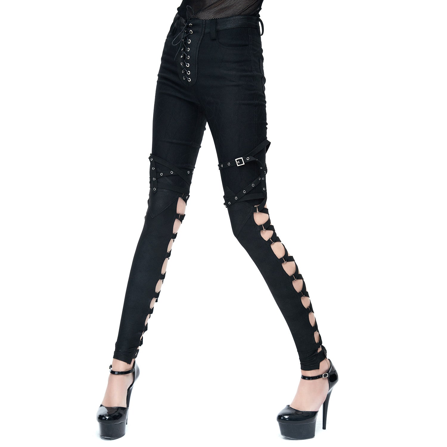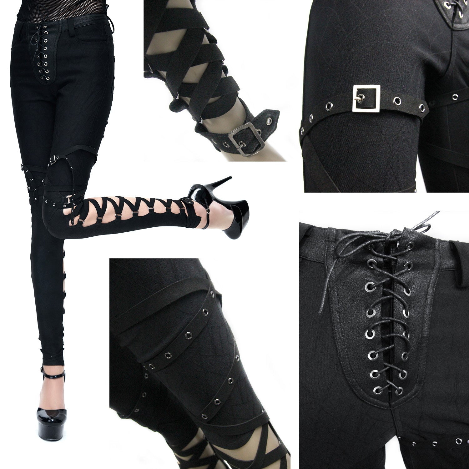 Esta calça preta é perfeita para quem procura um estilo ousado e alternativo. Com fivelas decorativas nas coxas, cordões cruzados na braguilha e uma abertura traseira com cruzados desde os joelhos até à parte inferior, este design é ideal para se destacar em qualquer evento gótico ou alternativo.