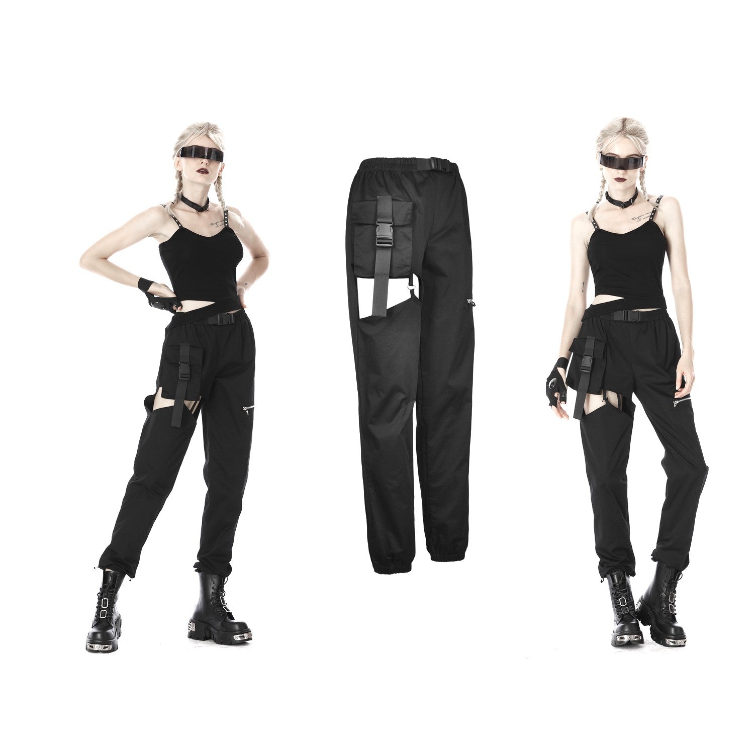 Calças pretas, largas e assimétricas com um bolso grande e uma abertura numa perna.