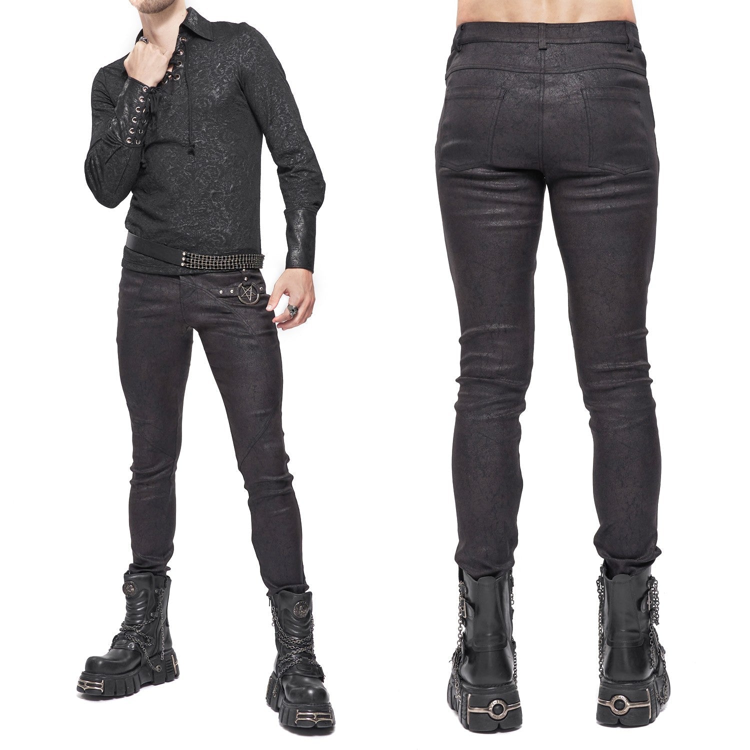 Calças pretas e justas com um pentagrama de um lado.