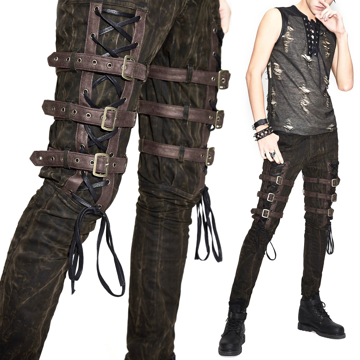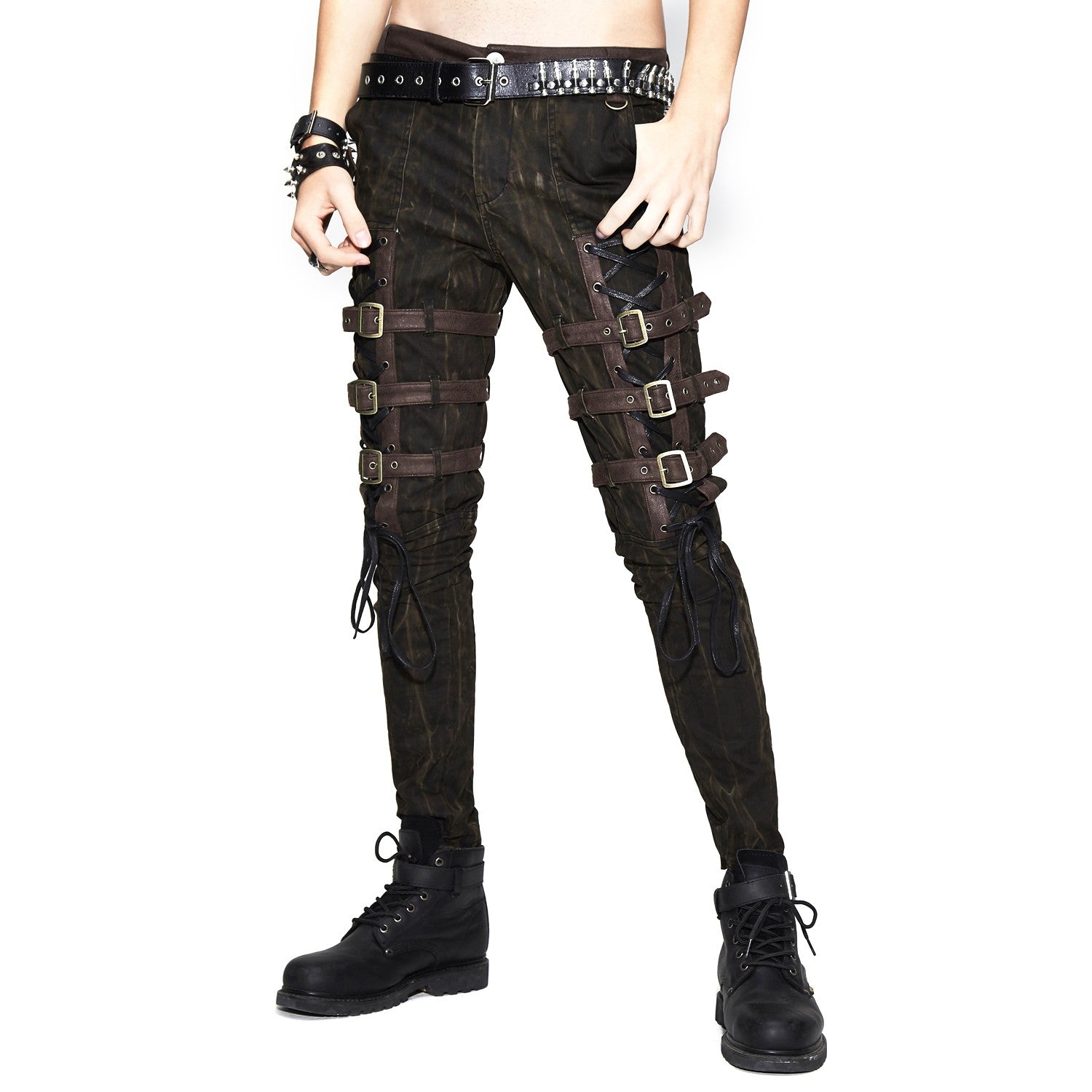 Calças castanhas com fivelas e cruzadas nas coxas. Bolsos à frente e atrás.