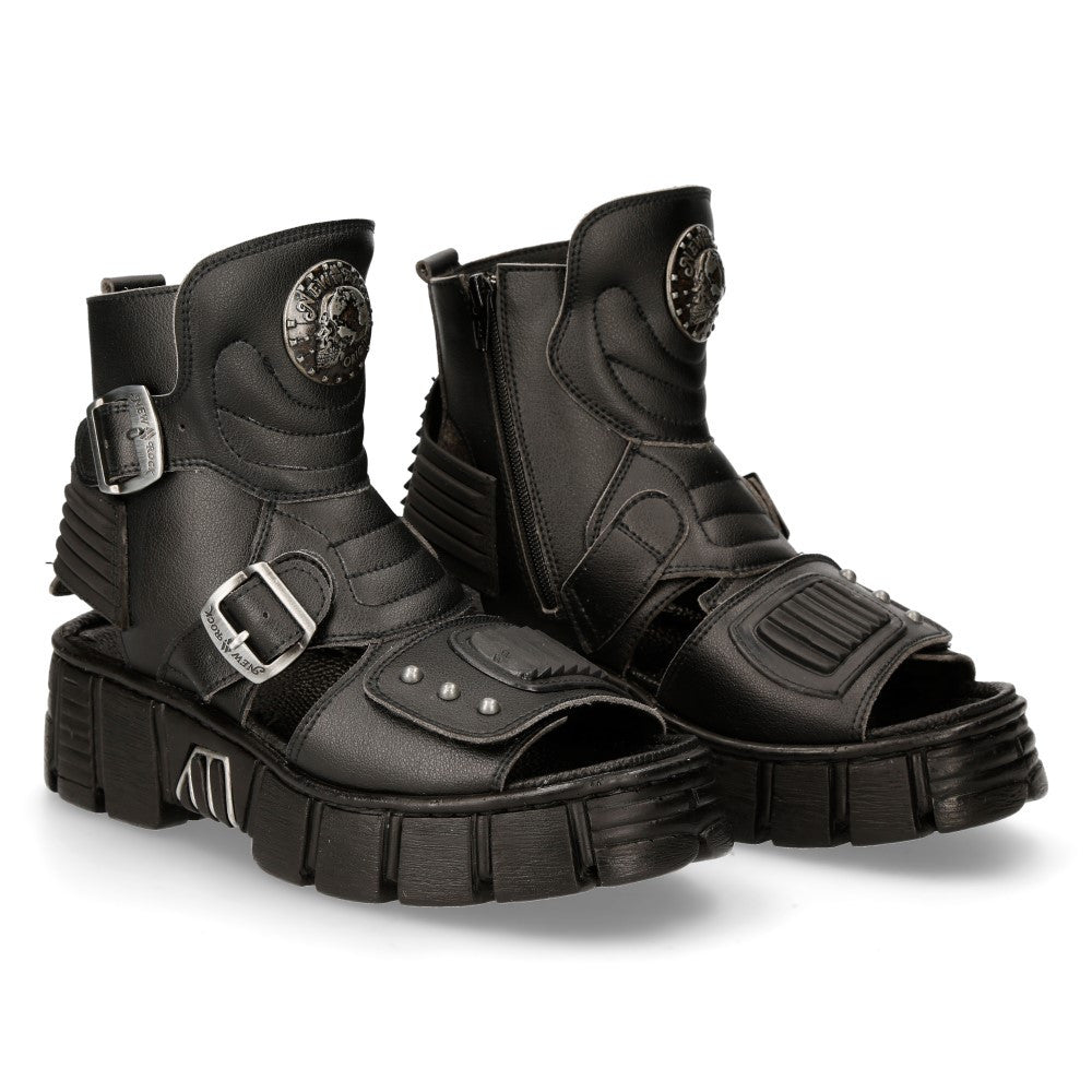 Descobre as sandálias New Rock pretas sintéticas com fecho de velcro e fivelas decorativas para um toque distintivo. Com uma cana de 12 cm, uma plataforma de 4 cm e um salto de 6 cm, oferecem a combinação perfeita de estilo e conforto. Estas sandálias New Rock são ideais para completar o teu look alternativo com um calçado que não passa despercebido.