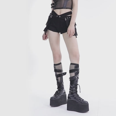 Destaca o teu estilo alternativo com os nossos versáteis calções com bolsos, decorados com tachas na cintura e um prático fecho éclair na parte da frente. Com a opção de remover os bolsos, estes calções oferecem um toque único e personalizável ao teu visual. Fabricados com uma mistura de viscose, poliéster, algodão e elastano, são uma opção confortável e elegante para qualquer ocasião. Não percas estes calções com bolsos!