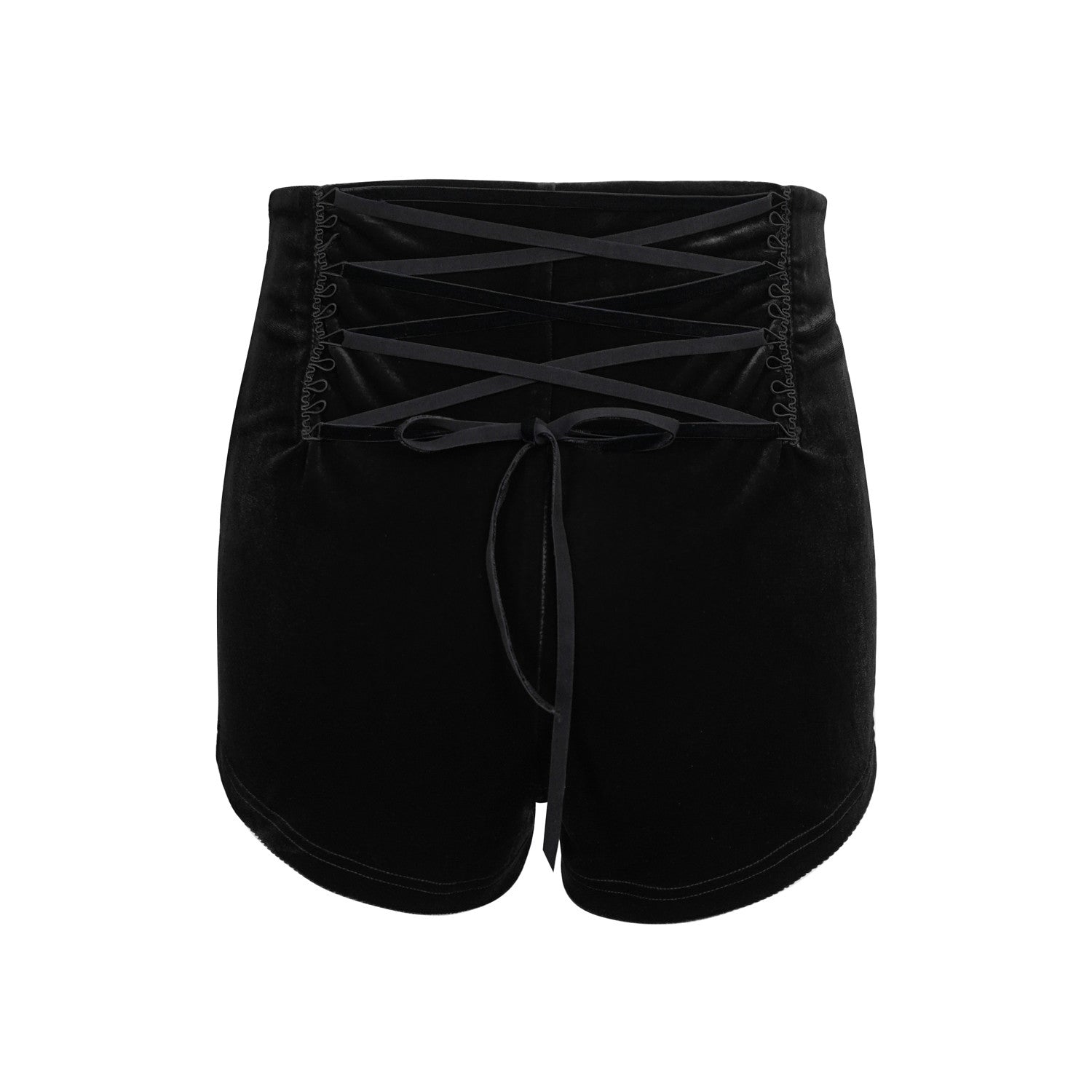 Shorts pretos de estilo alto e elegante com detalhes em guipura e correntes decorativas. Apresentam um fecho de correr frontal e cordões de cetim cruzados na parte de trás para um toque único. Composição: 97% poliéster, 3% spandex. Um elemento essencial para realçar o teu estilo alternativo e gótico em qualquer ocasião.