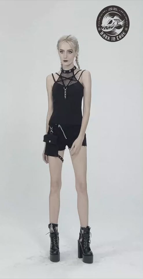 Calções pretos com um fecho de correr diagonal à frente. Bolso grande numa perna e racha na outra perna.
