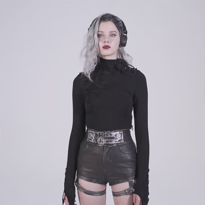 Calções pretos de polipiel com tiras com fivelas nas coxas. Fivelas decorativas à frente e cruzadas atrás.