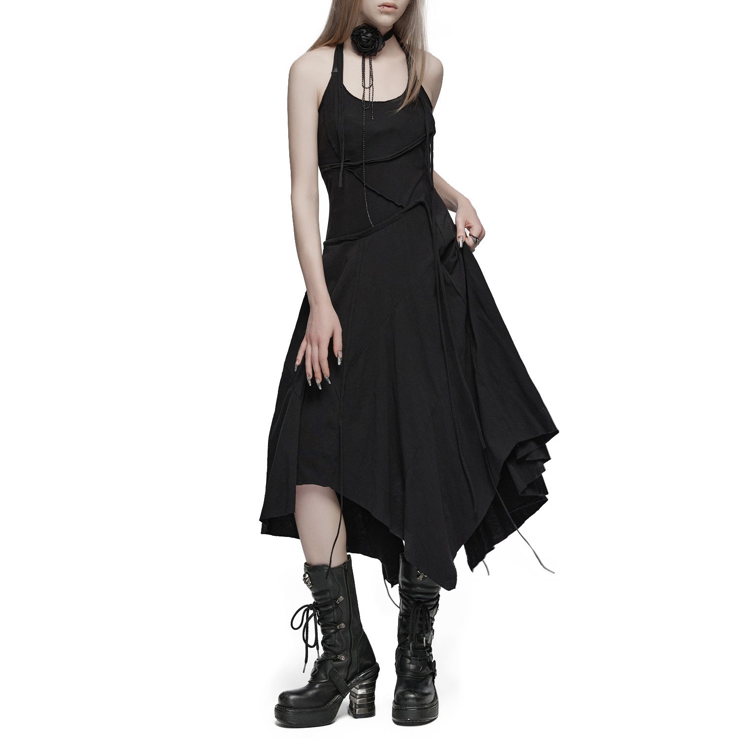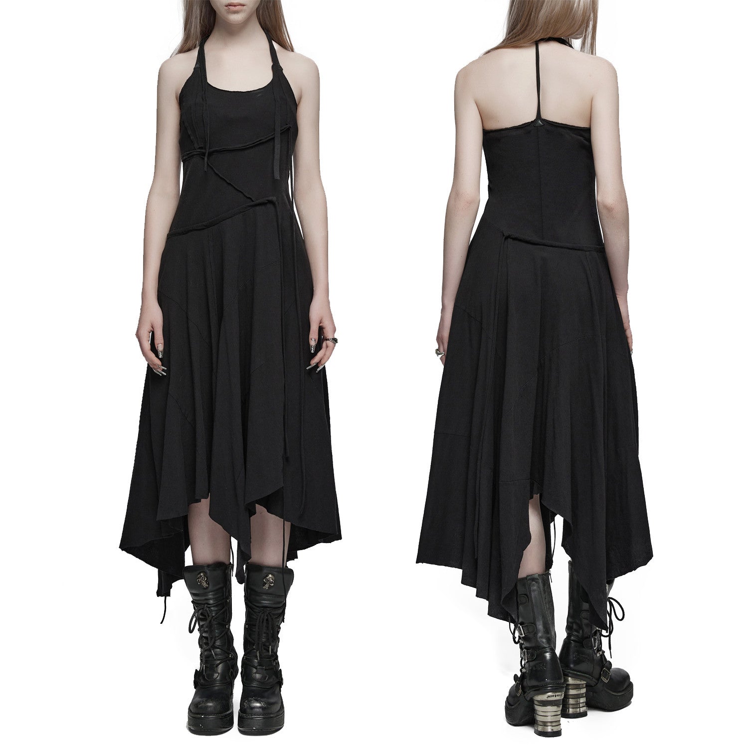 Destaca-te com o nosso elegante vestido assimétrico preto e comprido, com alças e bolsos que adicionam um toque único ao teu estilo gótico e alternativo. Esta peça permite-te destacar em qualquer ocasião, combinando a simplicidade do preto com detalhes audazes.