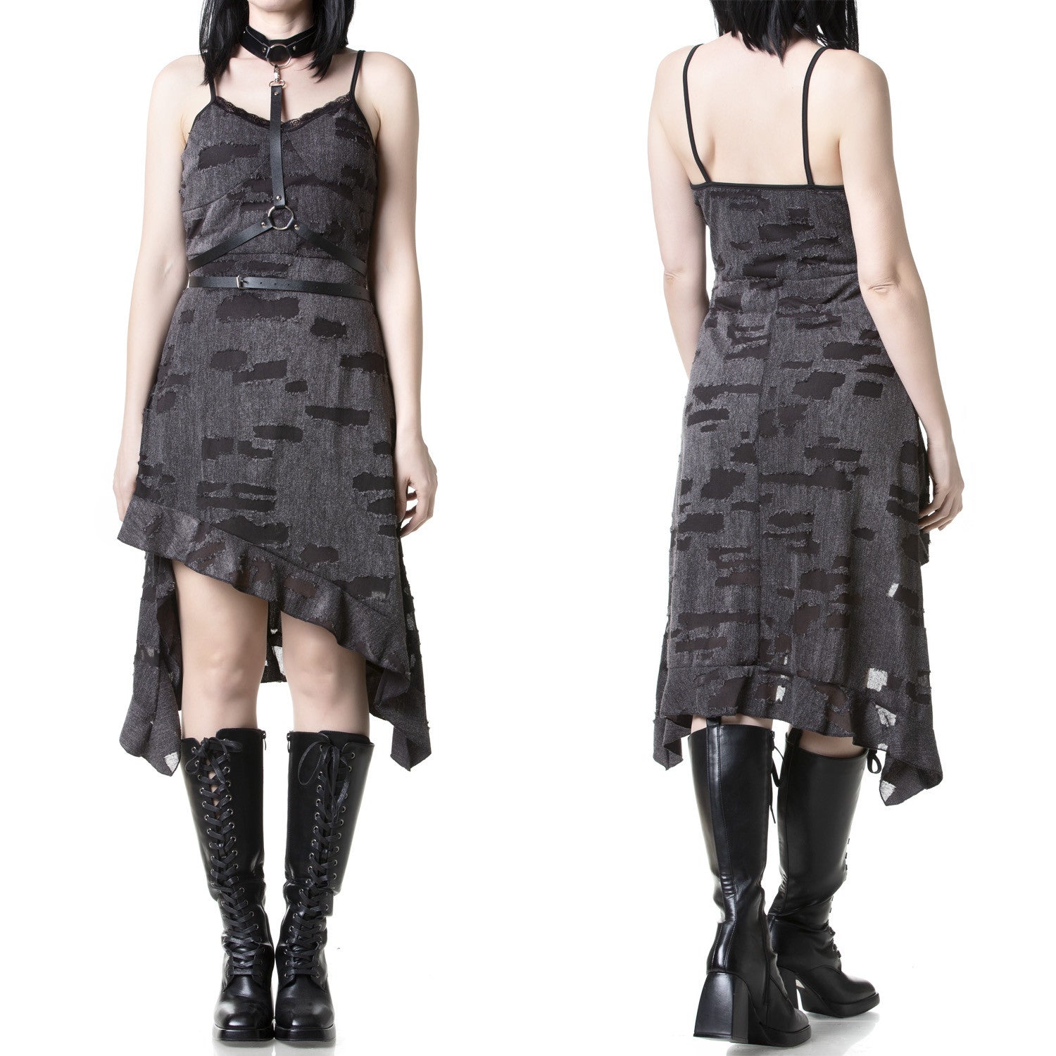 Vestido rasgado com alças e design assimétrico, perfeito para um estilo gótico e alternativo. Tem um fecho invisível num dos lados. Fabricado com 100% poliéster para um acabamento duradouro e marcante. Completa o teu look rebelde com este impactante vestido rasgado.