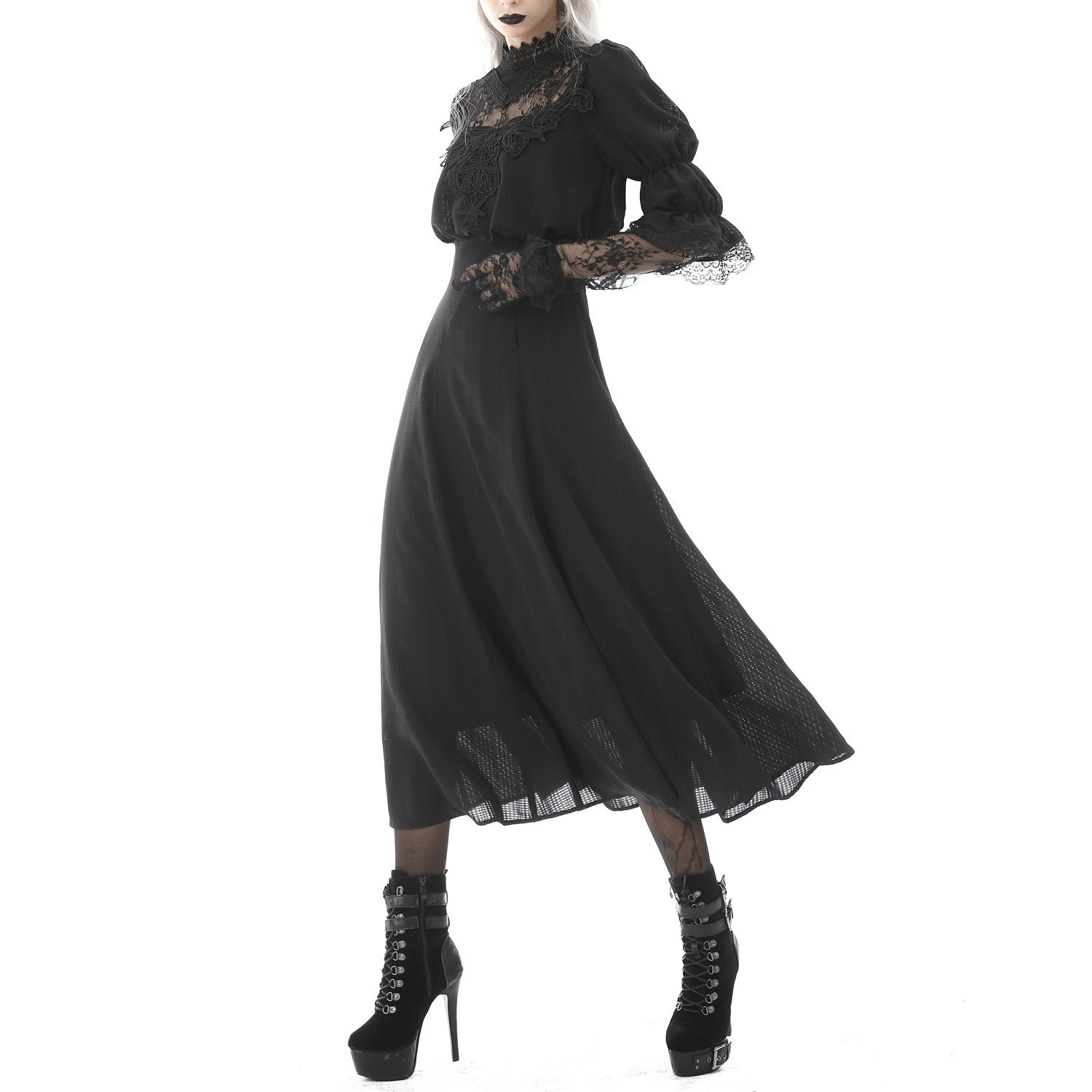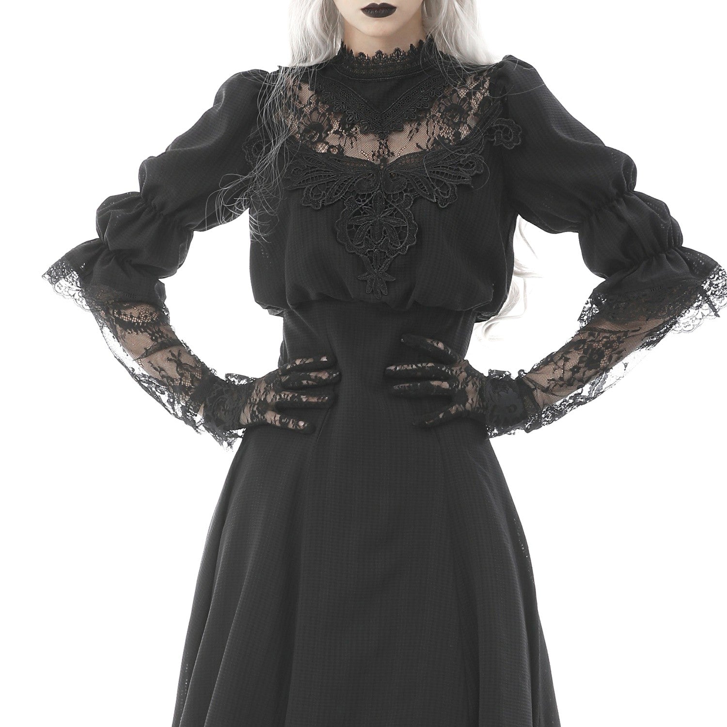 Vestido largo e preto com fecho éclair nas costas. Renda e guipura no decote. Mangas compridas com renda.