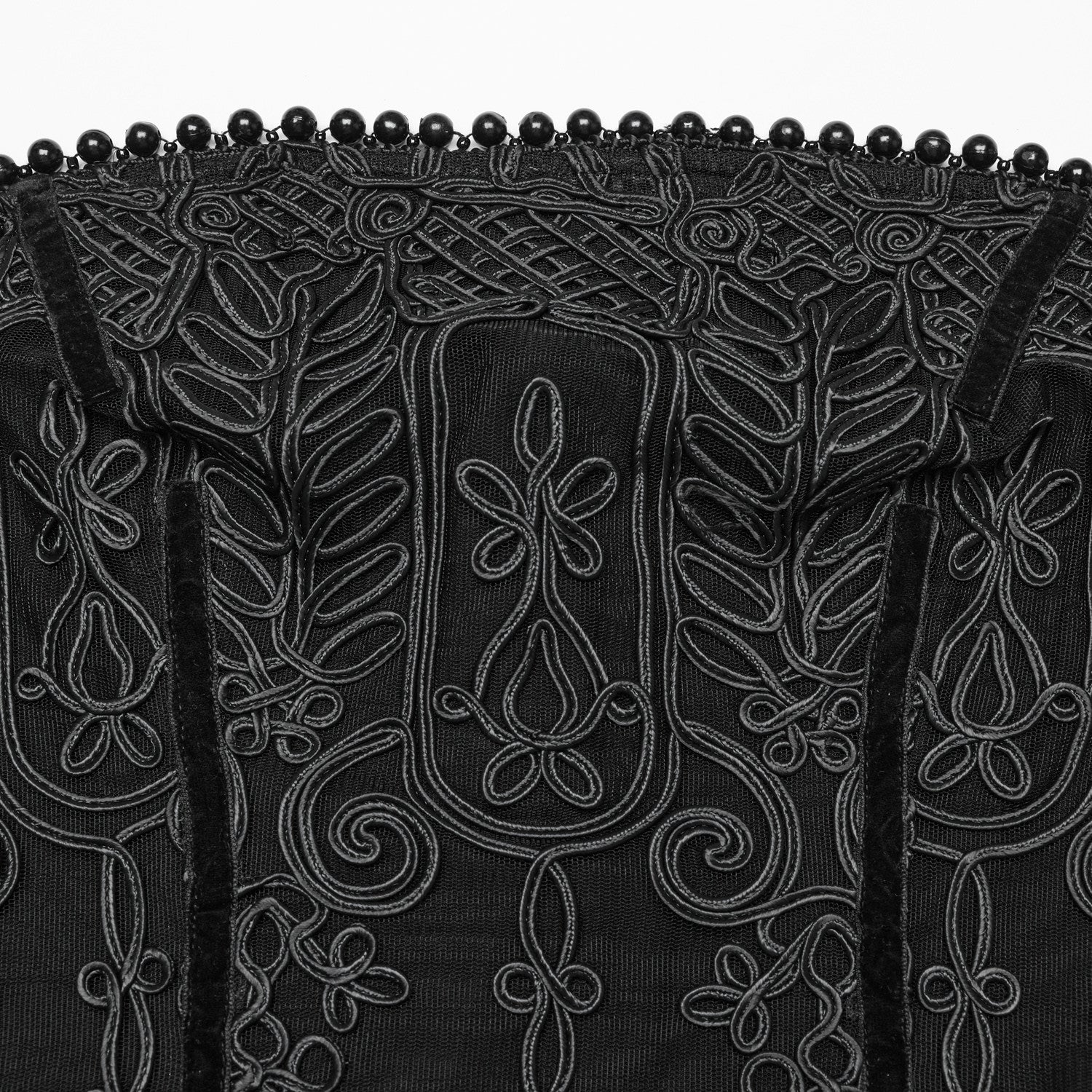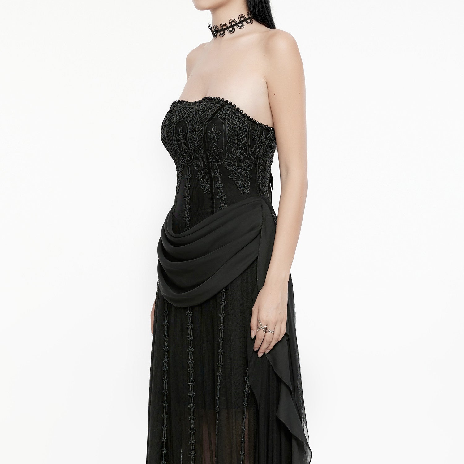 Vestido longo de estilo gótico-romântico, combinando texturas, rendas bordadas e transparências
