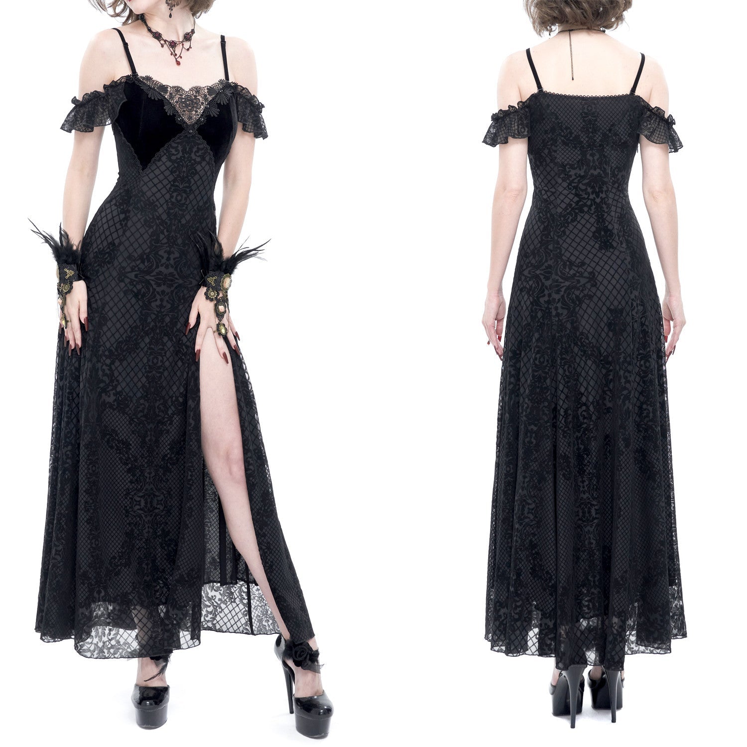Vestido largo com tecido de transparências e desenhos em veludo, detalhe no decote com guipura, alças e ombros descobertos.