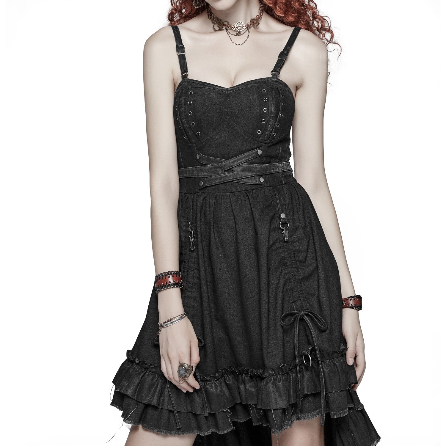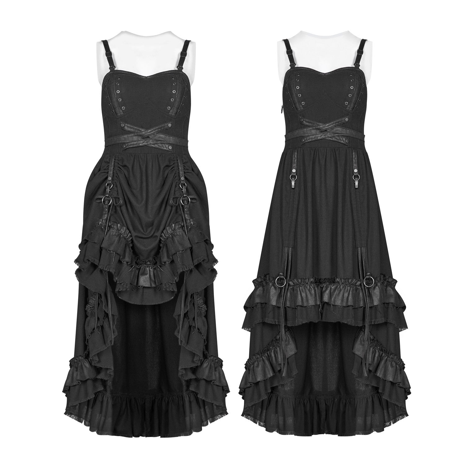 Vestido negro curto na frente e longo atrás. Alças com fivelas. Tiras de polipele abaixo do peito. Saia ajustável. Costas elásticas. Fecho lateral.