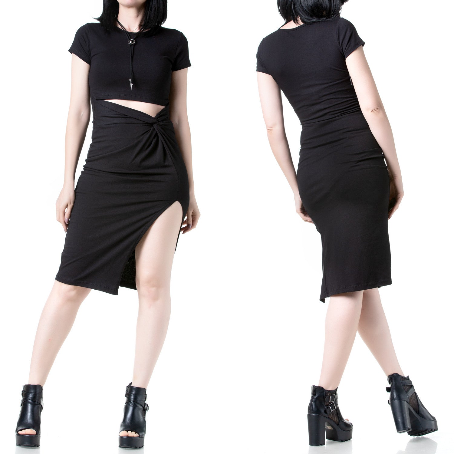 Descobre o encanto escuro com este vestido preto assimétrico, perfeito para qualquer ocasião alternativa. Com mangas curtas e uma audaciosa abertura na cintura, este vestido justo realça a tua figura. A racha numa perna adiciona um toque provocador e elegante. Medidas da modelo: 86-72-100 cm, altura: 170 cm.